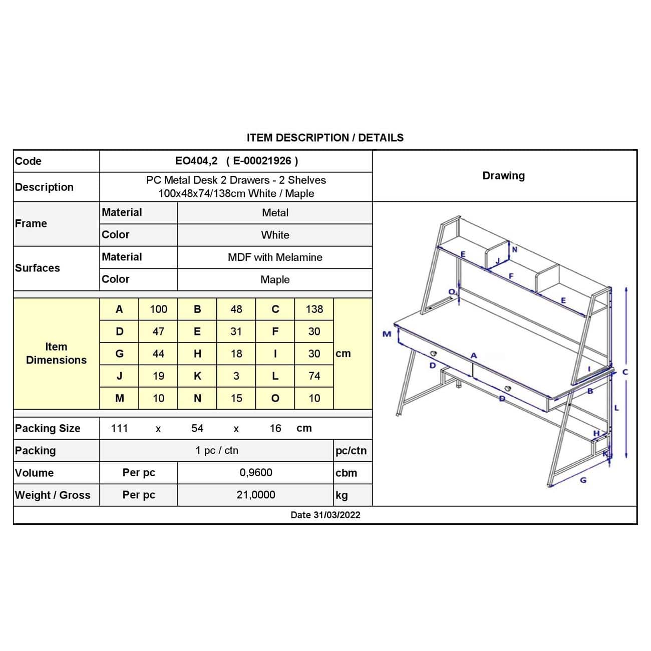 ΓΡΑΦΕΙΟ 2 Συρτάρια 2 Ράφια Μέταλλο Βαφή Άσπρο, MDF – Melamine Απόχρωση Maple 100x48x74/138cm
