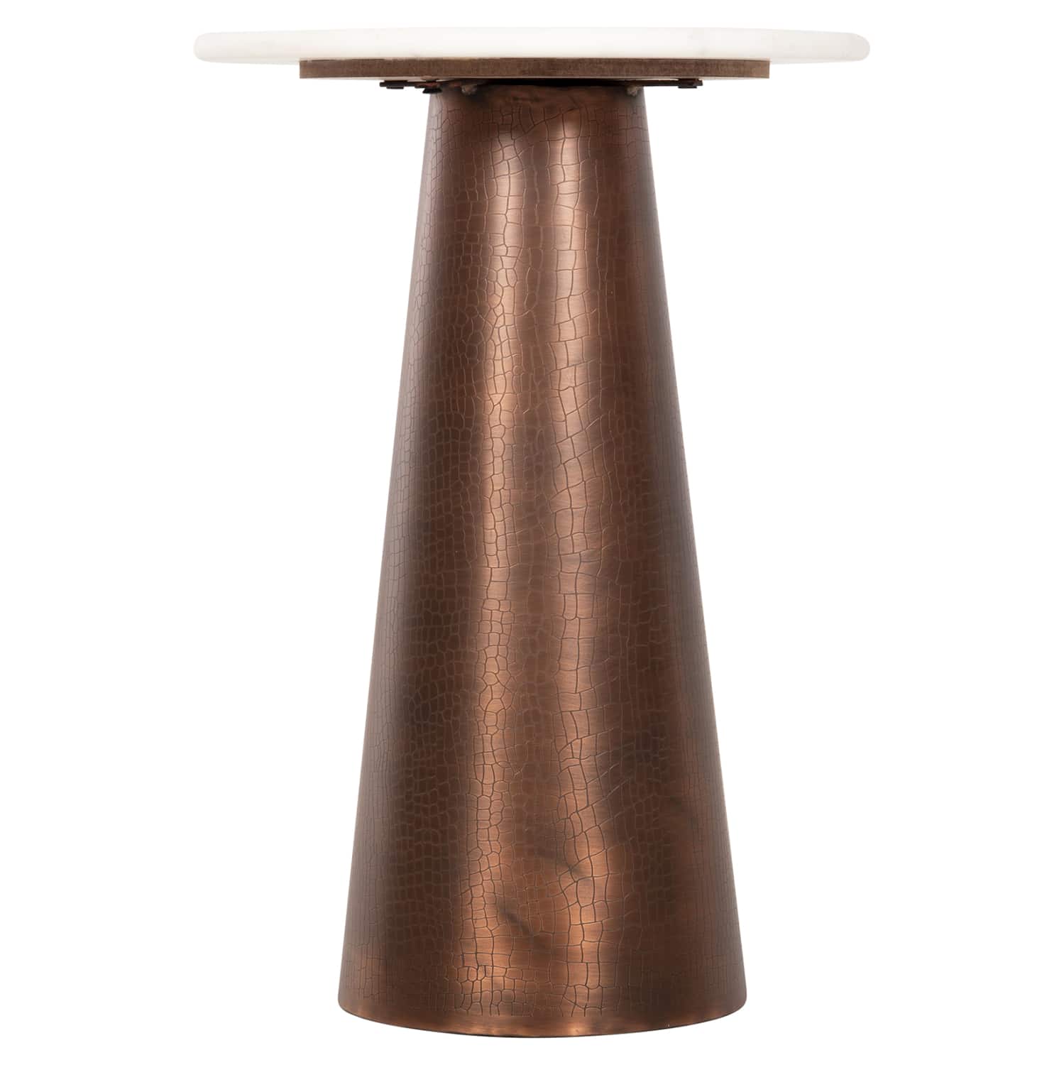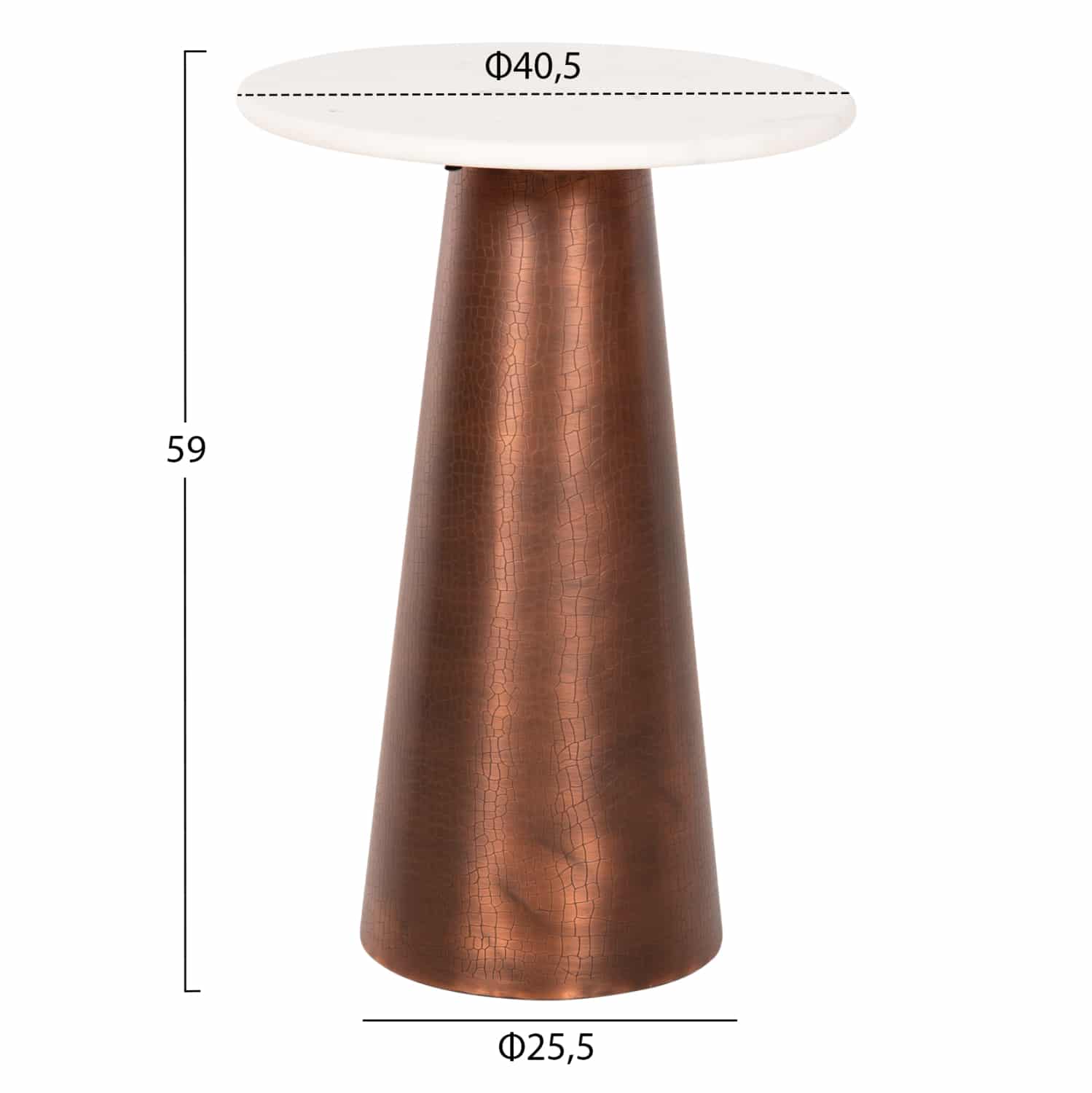Ανακαλύψτε το υπέροχο βοηθητικό τραπεζάκι FODEN για το σαλόνι. Πρόκειται για ένα μεταλλικό τραπεζάκι με στρογγυλή επιφάνεια από ΛΕΥΚΟ ΜΑΡΜΑΡΟ και κωνική μεταλλική βάση σε σκούρο ΧΑΛΚΙΝΟ χρώμα. Θα δώσει μια εικόνα καθαρότητας και πολυτέλειας στον χώρο σας. Ιδανικό τόσο για το σπίτι, όσο και για επαγγελματικούς χώρους.