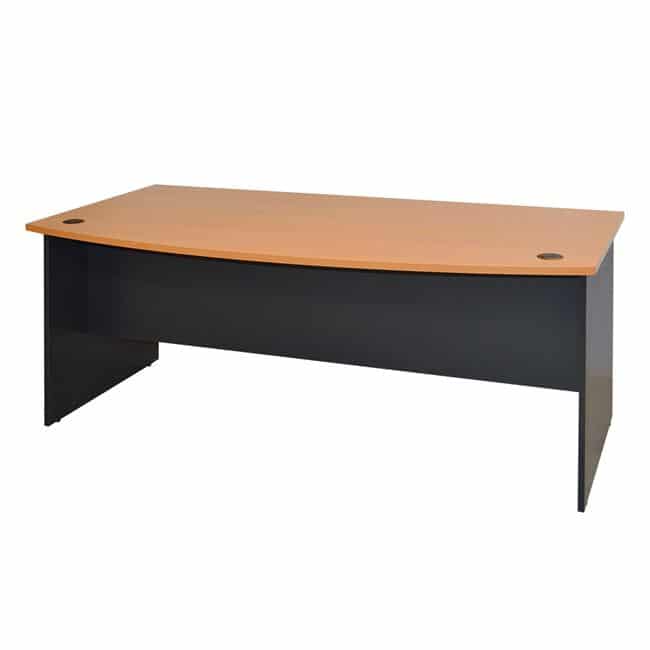 Επιφάνεια εργασίας από μελαμίνη πάχους 25mm στο χρώμα οξιάς, με δύο εισόδους καλωδίων πάνω απο τα πόδια.Το γραφείο ειναι οβάλ απο την μια πλευρά.Πόδια μελαμίνης πάχους 18mm σε χρώμα γκρί.