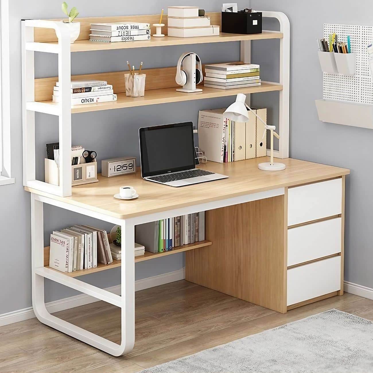 ΓΡΑΦΕΙΟ Η/Υ 3 Συρτάρια 3 Ράφια Μέταλλο Βαφή Άσπρο, MDF Απόχρωση Φυσικό  (Ε-00025835)
