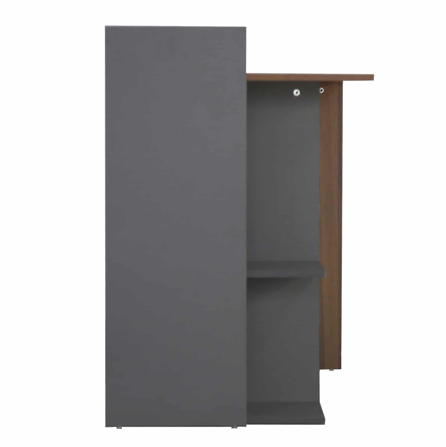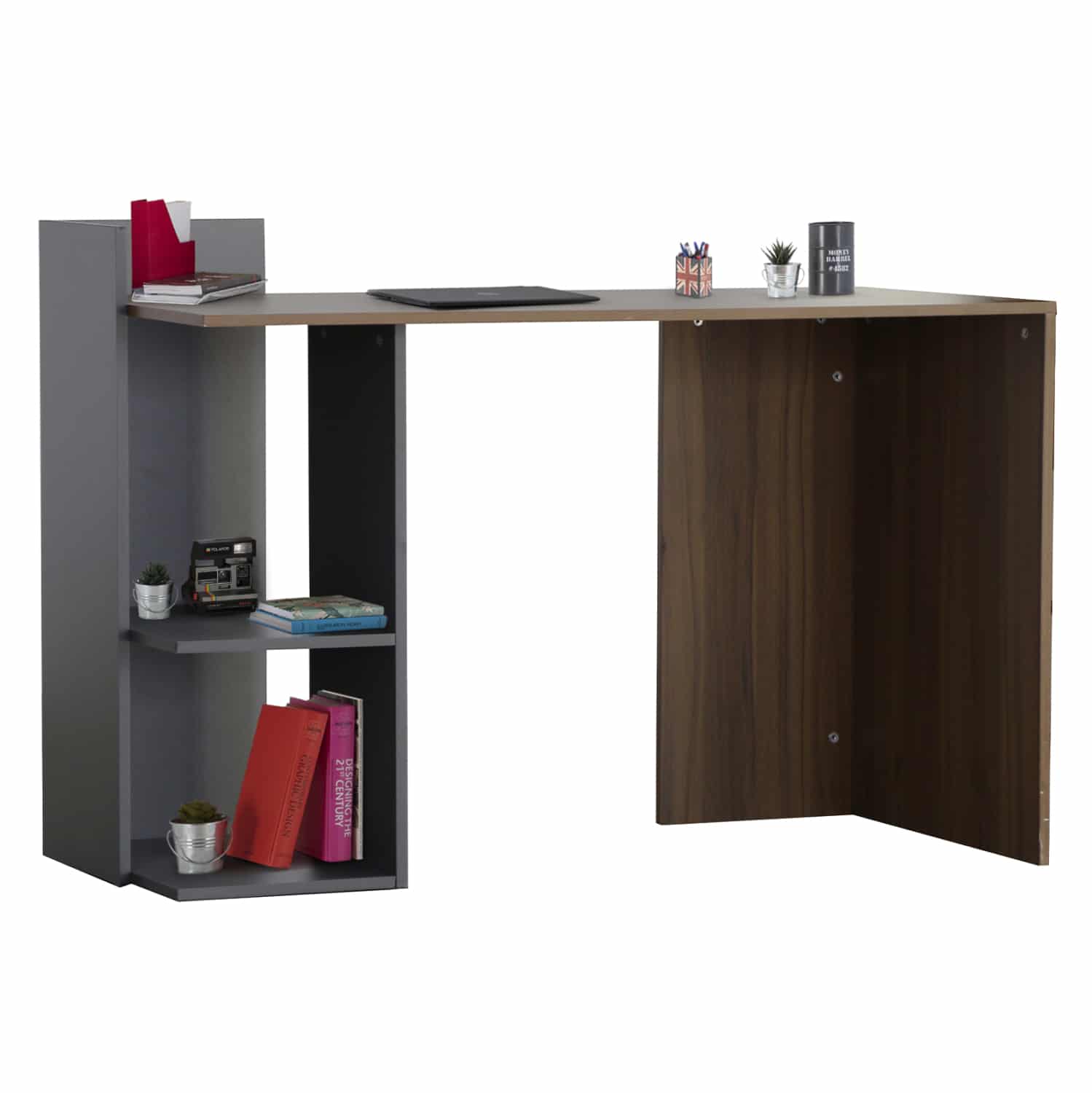 Μοντέρνο γραφείο με ενσωματωμένη βιβλιοθήκη, κατασκευασμένο από μελαμίνη υψηλών προδιαγραφών, σε διακριτική διχρωμία από καρυδί και γκρι απόχρωση.
