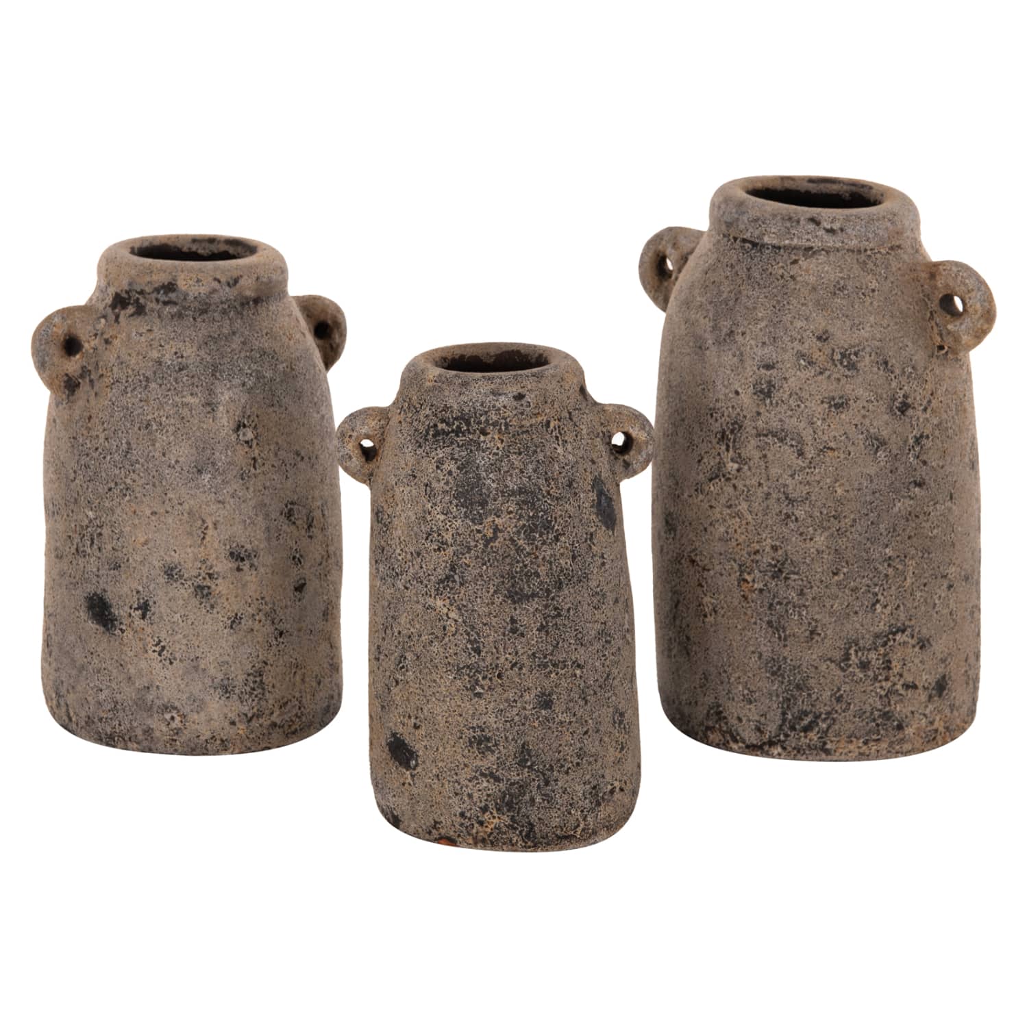 Τα διακοσμητικά βάζα ΗΜ7710.11 θα δώσουν μια άλλη «οπτική» στον χώρο σας. Πρόκειται για 3 βάζα με «αυτάκια» σε διαφορετικές διαστάσεις φτιαγμένες από τερακότα και το χρώμα τους είναι το παλαιωμένο ΓΚΡΙ.