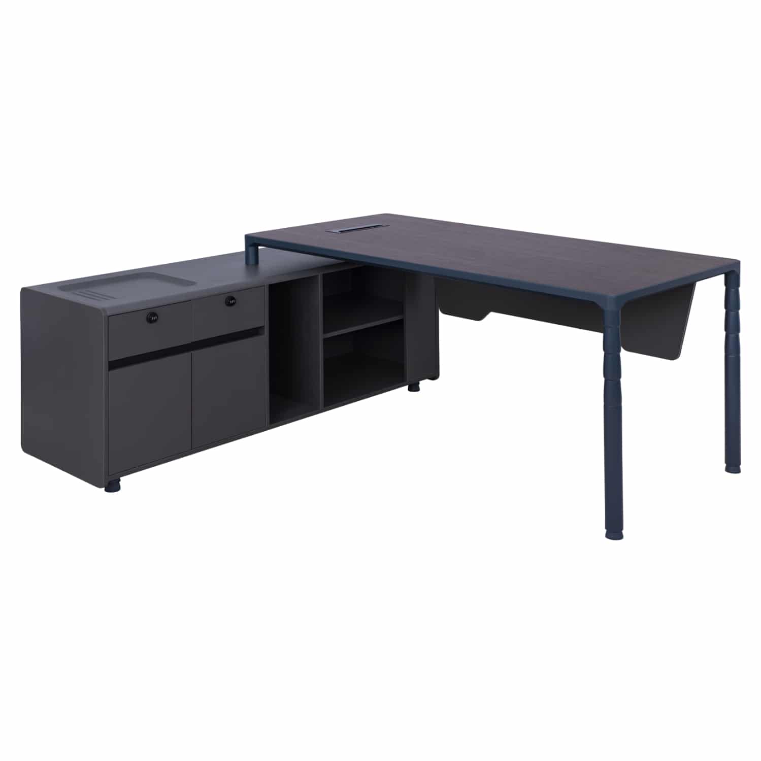 Επαγγελματικό γραφείο με αριστερή γωνία, κατασκευασμένο από μελαμίνη υψηλής ποιότητας, σε γκρι και βέγγε απόχρωση και πόδια αλουμινίου σε σκούρο μπλε χρώμα.