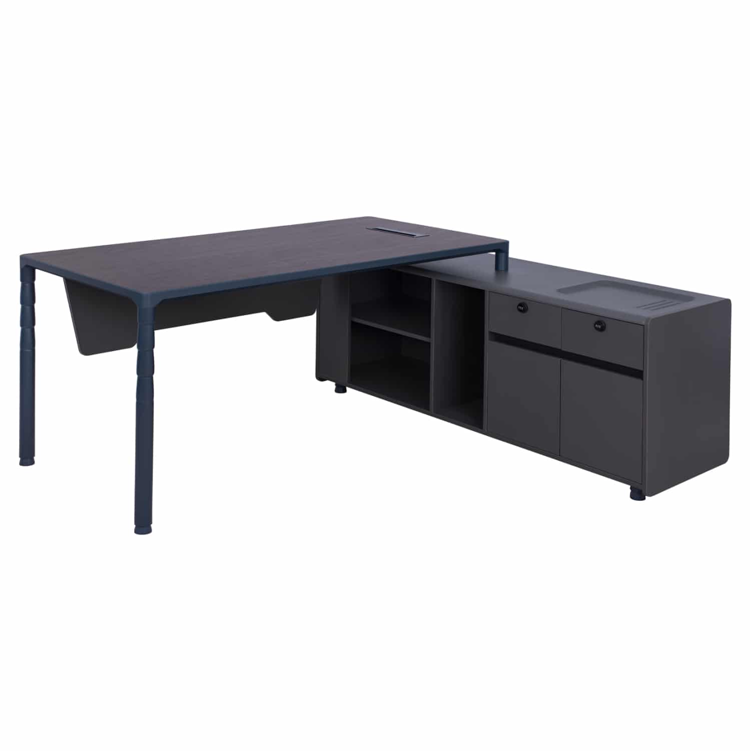 Επαγγελματικό γραφείο με δεξιά γωνία, κατασκευασμένο από μελαμίνη υψηλής ποιότητας, σε γκρι και βέγγε απόχρωση και πόδια αλουμινίου σε σκούρο μπλε χρώμα.
