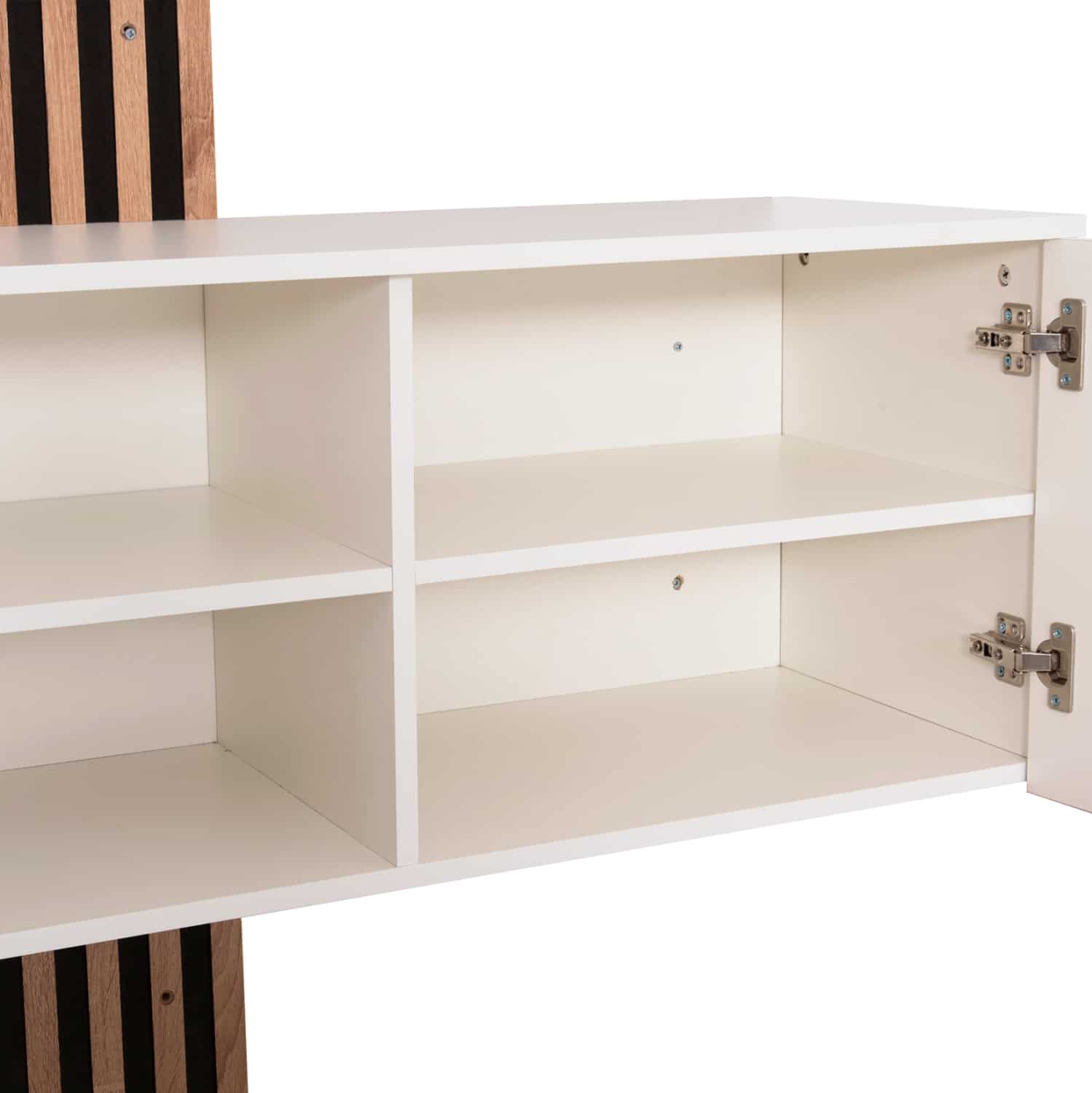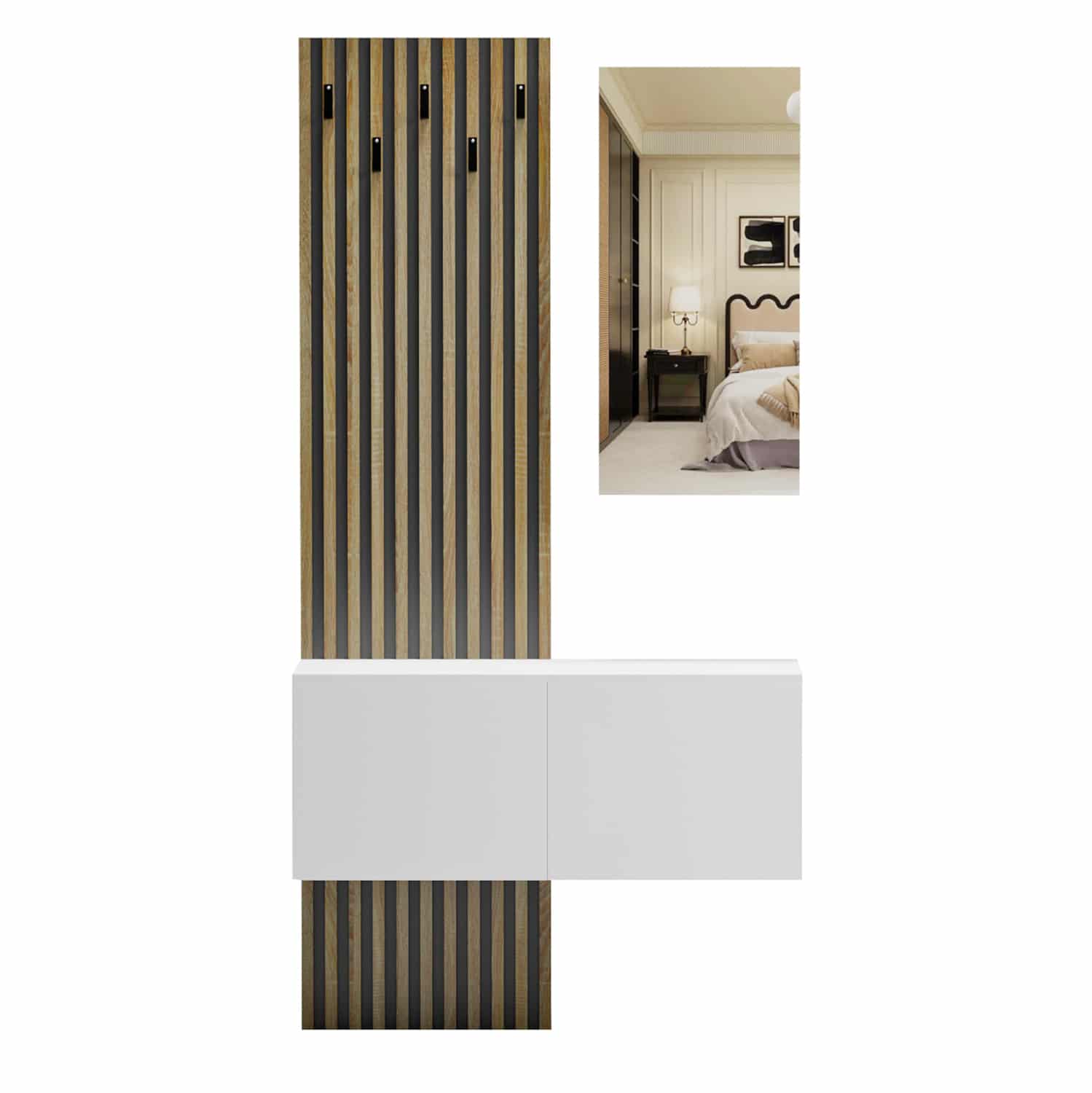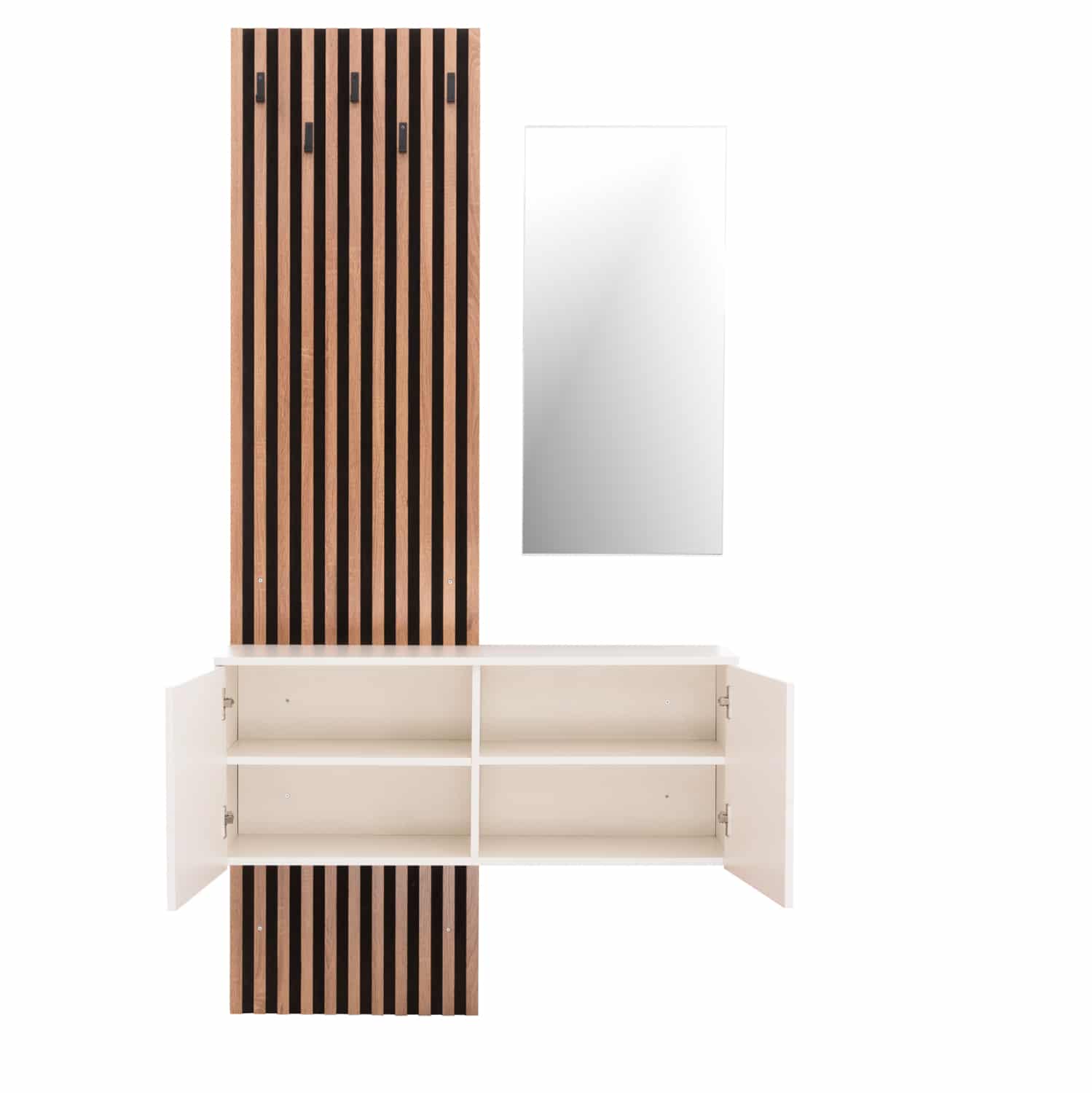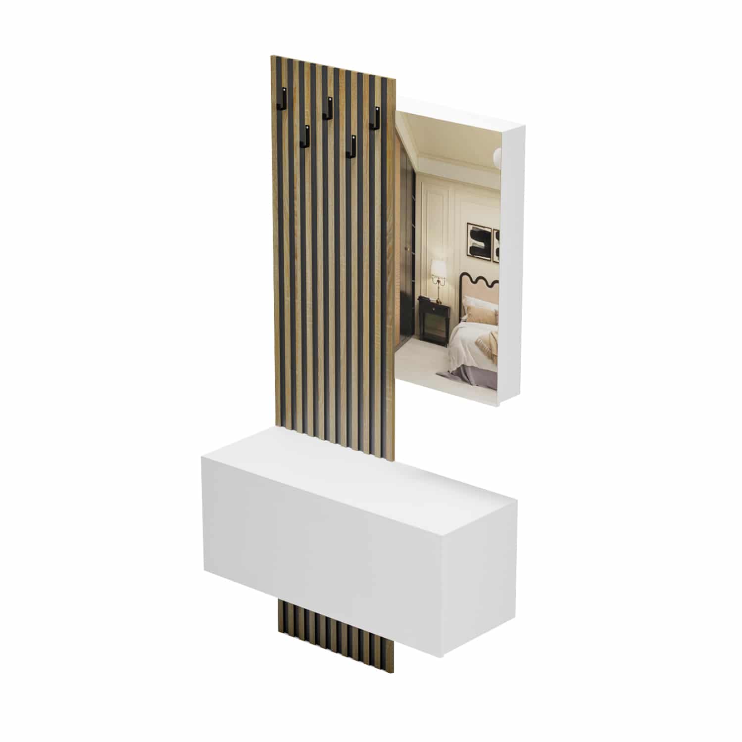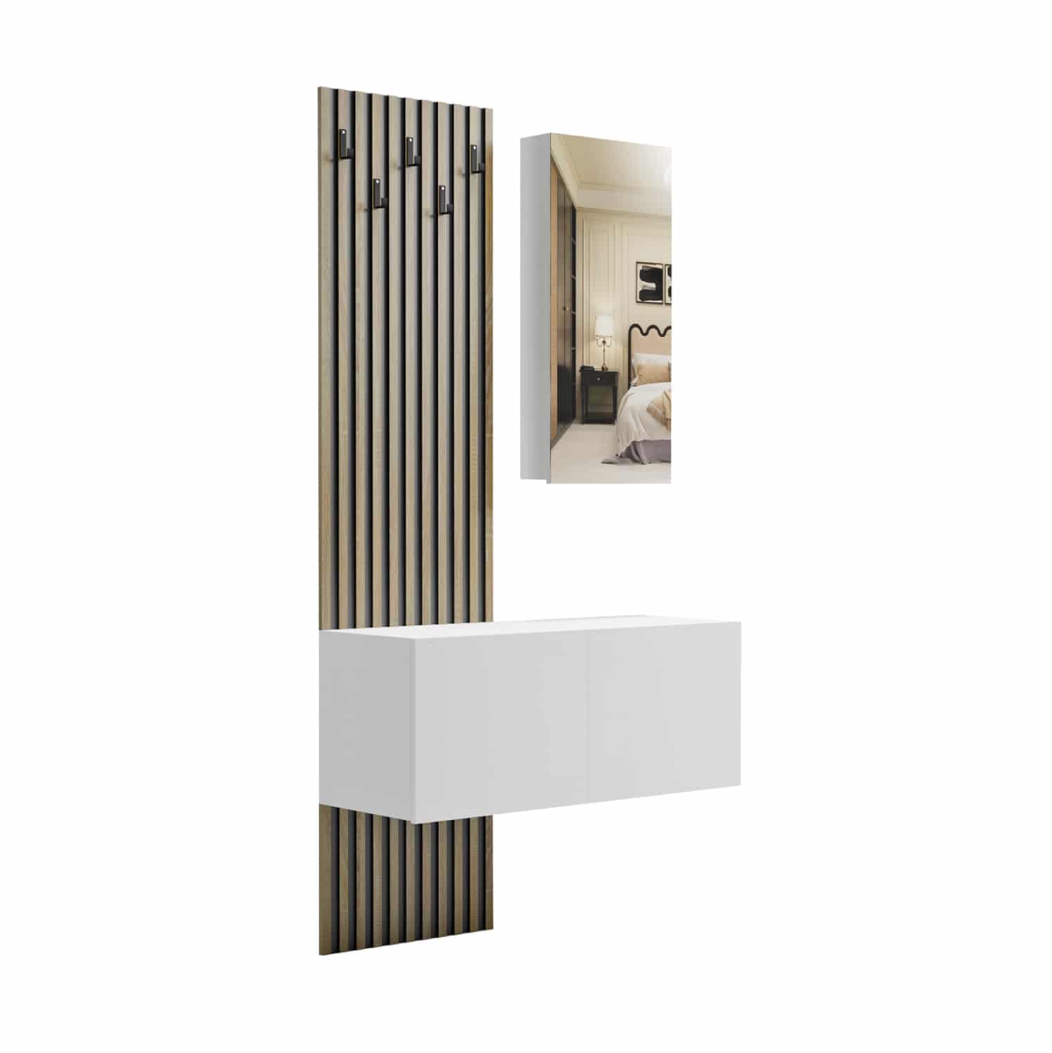 Το έπιπλο εισόδου MYLES αποτελείται από μια μακρόστενη ψηλή «πλάτη» με 5 μονές κρεμάστρες στην μία πλευρά, ενώ στην άλλη υπάρχει ένα επιτοίχιο ντουλάπι με ένα ράφι στο εσωτερικό που κλείνει με πόρτα/καθρέπτη. Η σύνθεση αυτή ολοκληρώνεται με μια επίσης επιτοίχια (κρεμαστή)παπουτσοθήκη-ντουλάπι με δύο πόρτες, χωρισμένη σε 4 χώρους. Ένα σετ μελαμίνης σε χρώμα SONAMA-ΛΕΥΚΟ που θα σας ενθουσιάσει με την πρακτικότητα αλλά και το στυλ του.