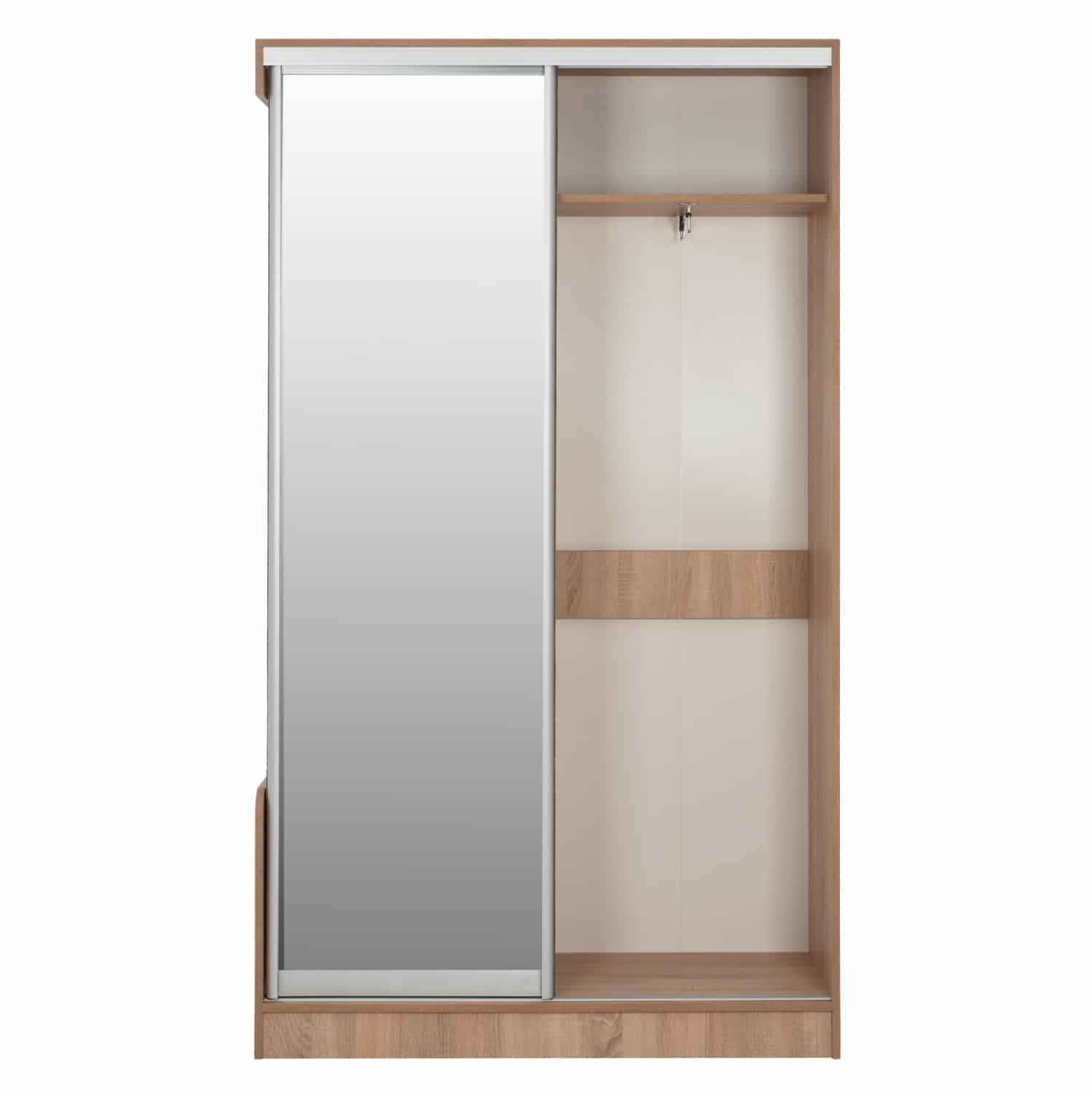 Μία σύνθεση επίπλου που συνδυάζει στη δεξιά πλευρά συρόμενη ντουλάπα με μεγάλο καθρέπτη εξωτερικά, ενώ εσωτερικά διαθέτει 1 ράφι στο επάνω μέρος και μια κάθετη συρόμενη προς τα έξω ράβδο κρέμασης, που διευκολύνει το κρέμασμα των ρούχων.