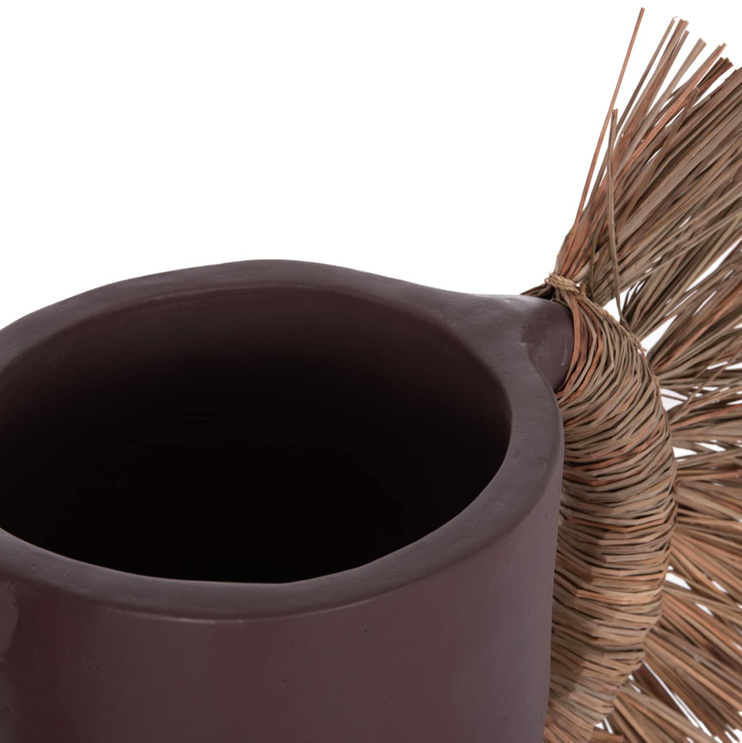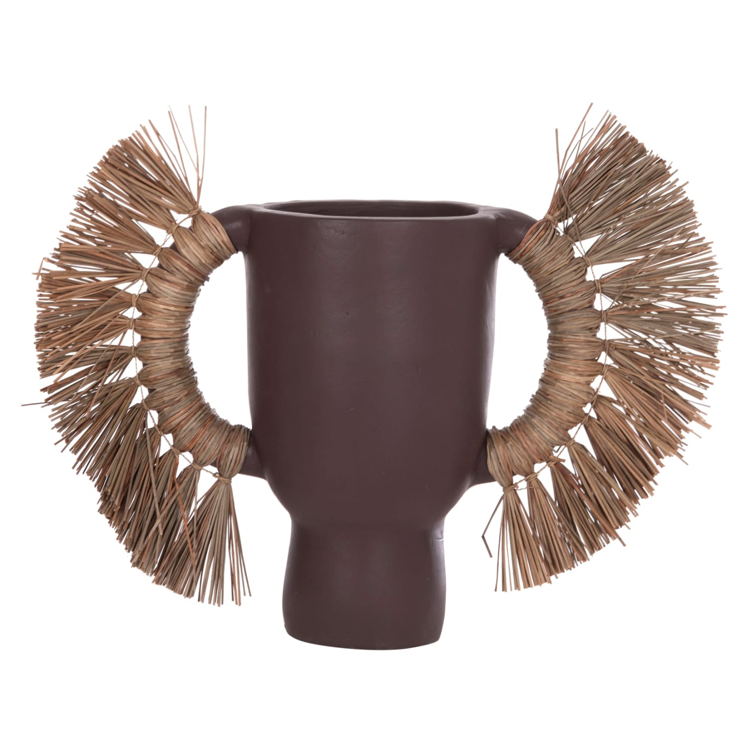 Το επιτραπέζιο χειροποίητο διακοσμητικό βάζο ALICA είναι ένα πολύ ιδιαίτερο διακοσμητικό στοιχείο για κάθε χώρο. Είναι κατασκευασμένο εξολοκλήρου από τερακότα σε ΣΟΚΟΛΑΤΙ χρώμα, ενώ διαθέτει και δύο χερούλια επενδυμένα με αποξηραμένο grass, και ένα φαρδύ στόμιο.