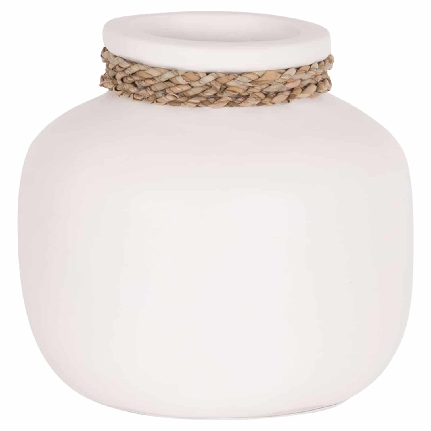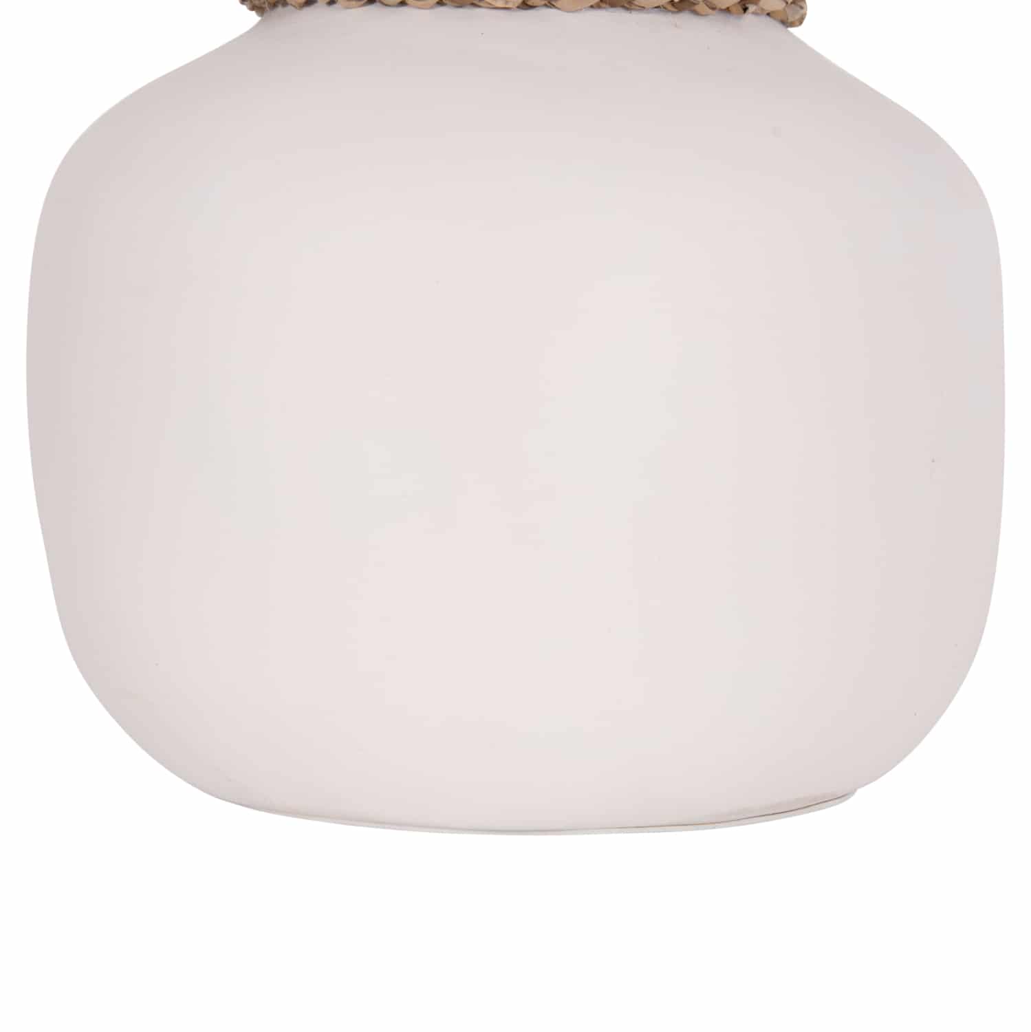 Το επιτραπέζιο χειροποίητο διακοσμητικό βάζο CAMMER είναι κατασκευασμένο εξολοκλήρου από τερακότα σε ΛΕΥΚΟ χρώμα ενώ διαθέτει διακοσμητική πλέξη από seagrass περιμετρικά στον «λαιμό» του βάζου. Ιδανικό για πληθώρα χώρων, τόσο για το σπίτι, όσο και για επαγγελματικούς χώρους.