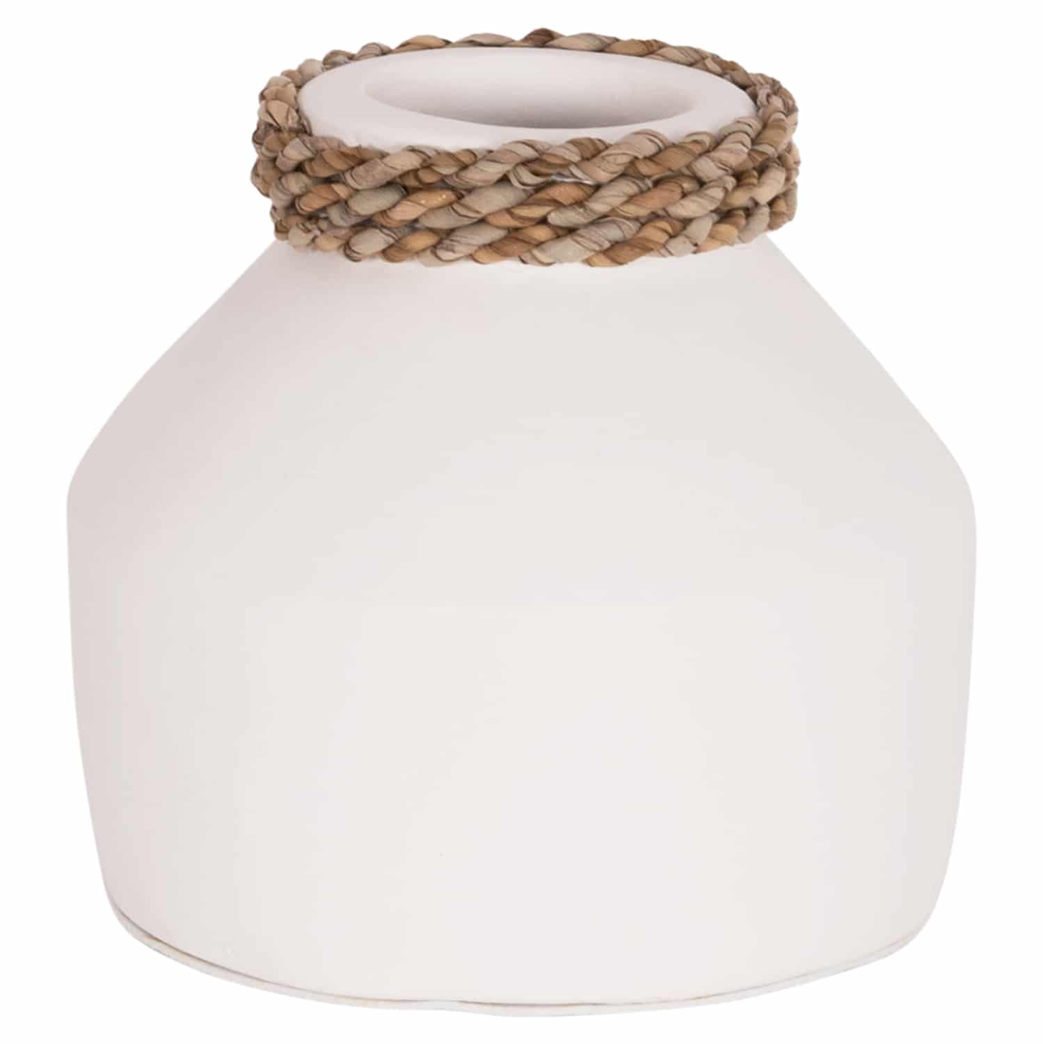 Το επιτραπέζιο χειροποίητο διακοσμητικό βάζο CAMMER είναι κατασκευασμένο εξολοκλήρου από τερακότα σε ΛΕΥΚΟ χρώμα ενώ διαθέτει διακοσμητική πλέξη από seagrass περιμετρικά στον «λαιμό» του βάζου. Ιδανικό για πληθώρα χώρων, τόσο για το σπίτι, όσο και για επαγγελματικούς χώρους.