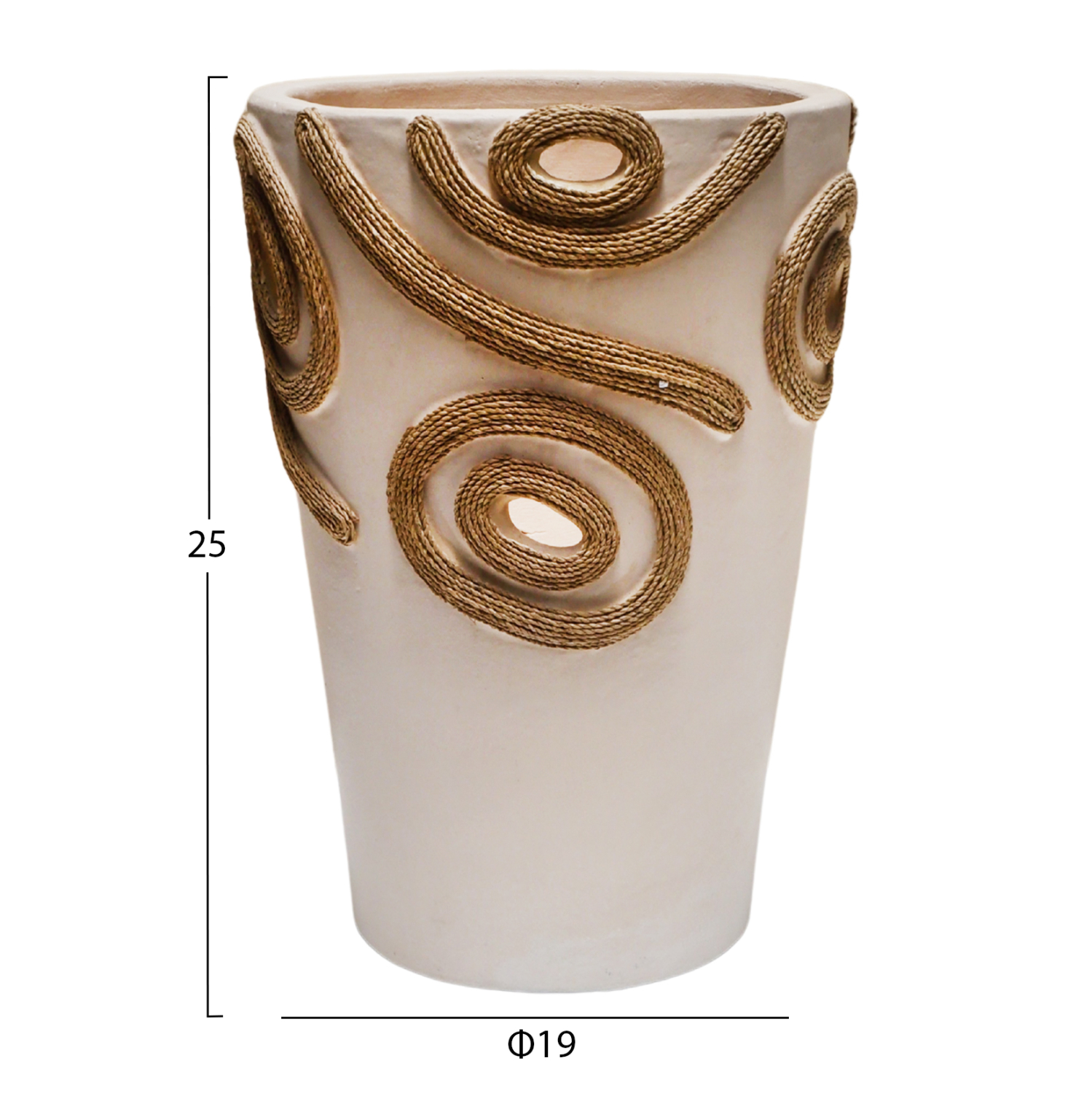 Το επιτραπέζιο χειροποίητο διακοσμητικό βάζο DEAN είναι λιτό σε κλασσικό σχέδιο. Είναι κατασκευασμένο εξολοκλήρου από τερακότα σε ΚΡΕΜ χρώμα ενώ διαθέτει διακοσμητικά σχέδια με σχοινί από ίνες φοίνικα κολλημένο στις πλευρές του βάζου. Ιδανικό για πληθώρα χώρων, τόσο για το σπίτι, όσο και για επαγγελματικούς χώρους.