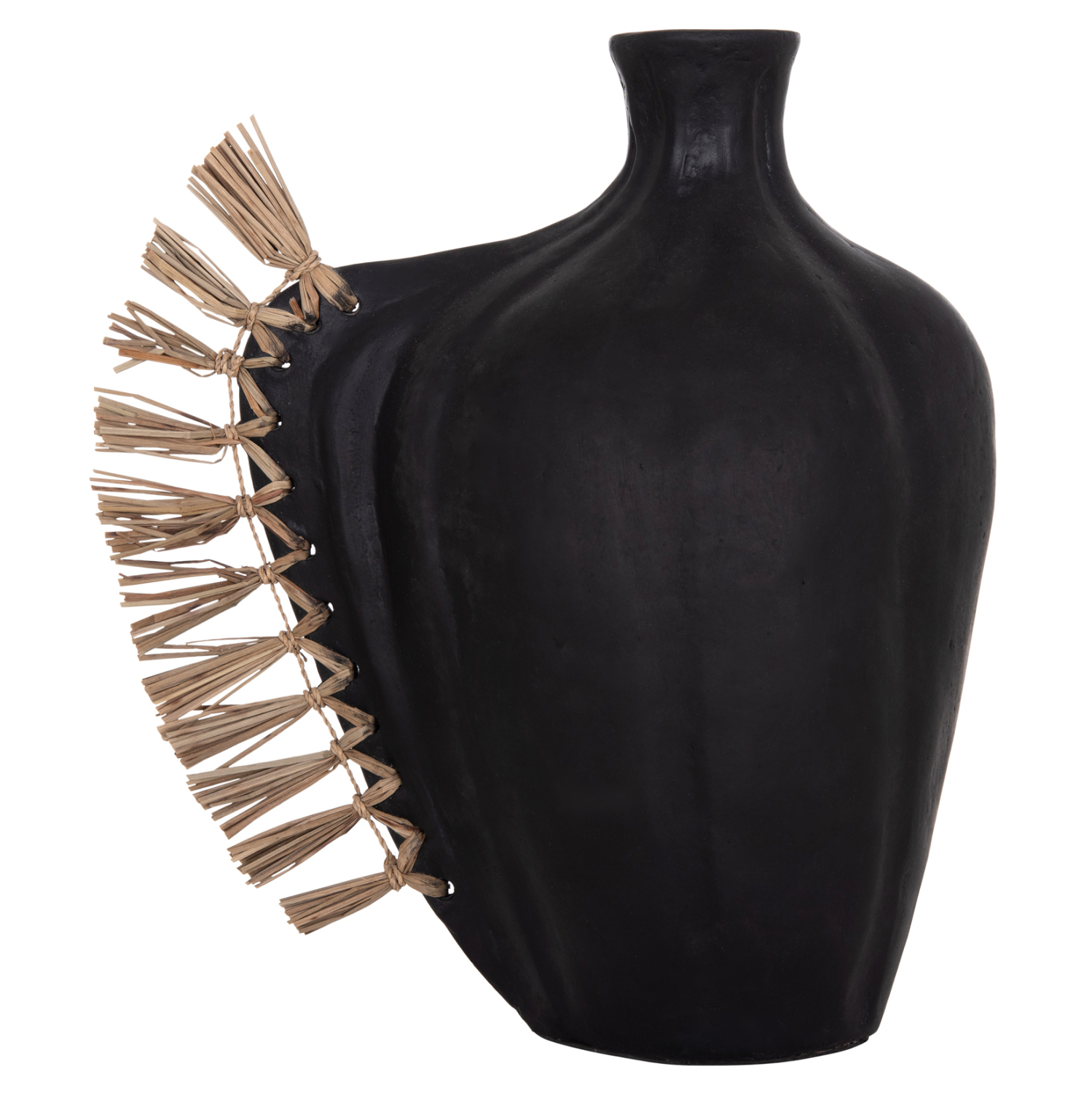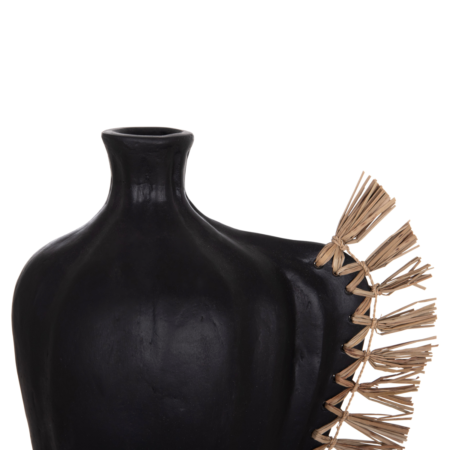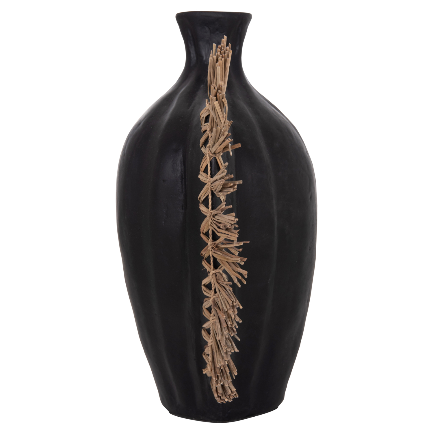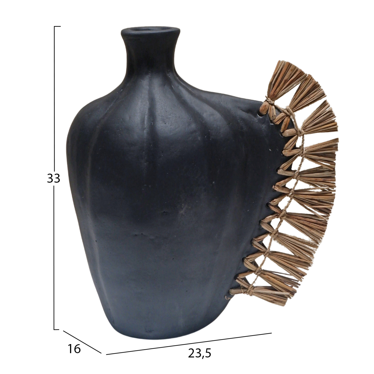 Το επιτραπέζιο χειροποίητο διακοσμητικό βάζο JEBB διαθέτει στενό στόμιο και είναι ένα πολύ ιδιαίτερο διακοσμητικό στοιχείο για κάθε χώρο. Ακολουθώντας την τελευταία τάση στην εσωτερική διακόσμηση, είναι κατασκευασμένο εξολοκλήρου από σχεδόν σαγρέ τερακότα σε ΜΑΥΡΟ χρώμα, ενώ στην μία πλευρά διαθέτει διακόσμηση με αποξηραμένο grass.