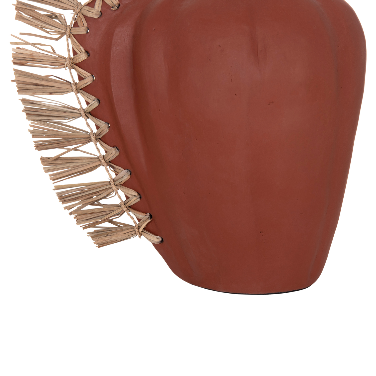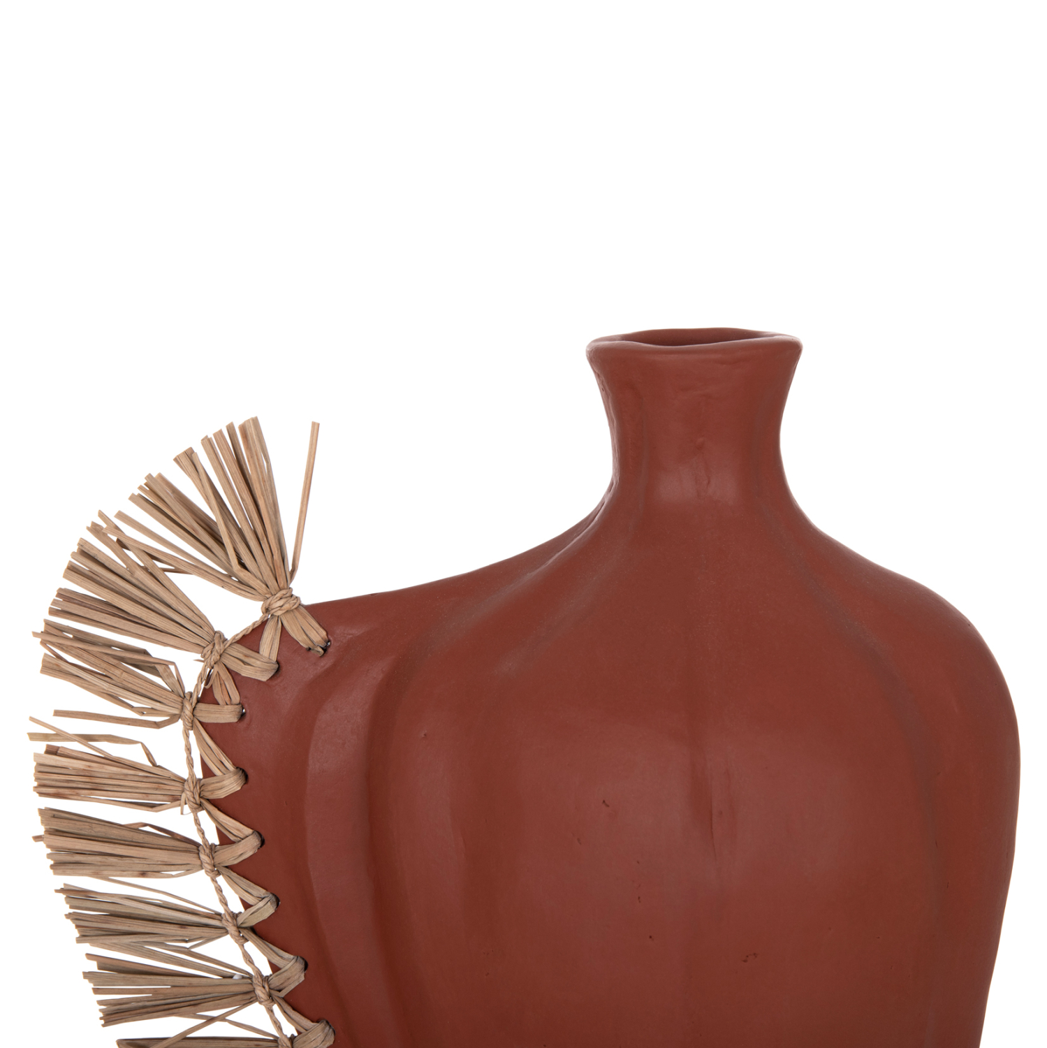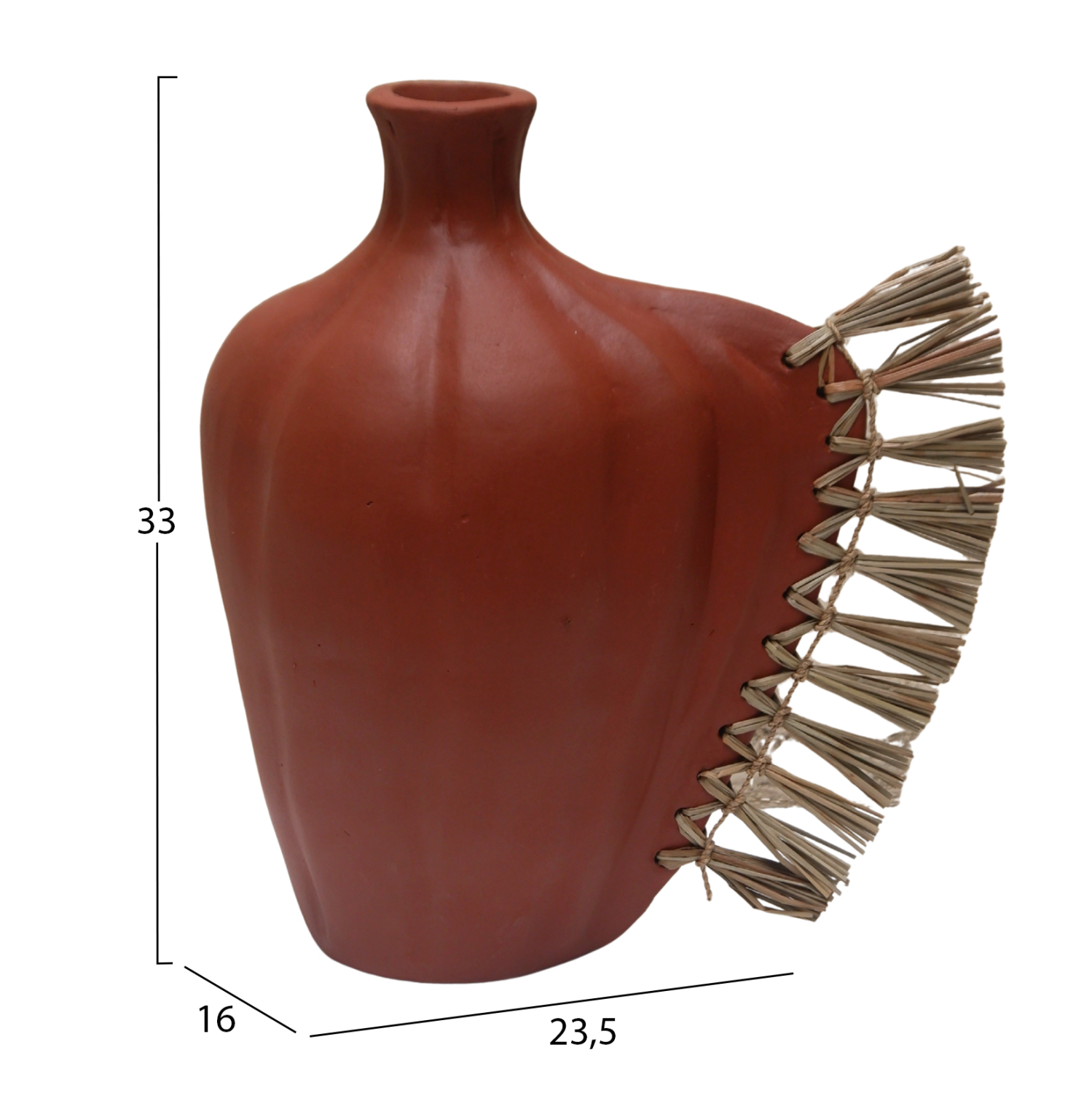 Το επιτραπέζιο χειροποίητο διακοσμητικό βάζο JEBB διαθέτει στενό στόμιο και είναι ένα πολύ ιδιαίτερο διακοσμητικό στοιχείο για κάθε χώρο. Ακολουθώντας την τελευταία τάση στην εσωτερική διακόσμηση, είναι κατασκευασμένο εξολοκλήρου από σχεδόν σαγρέ τερακότα στο ΦΥΣΙΚΟ της χρώμα, ενώ στην μία πλευρά διαθέτει διακόσμηση με αποξηραμένο grass.