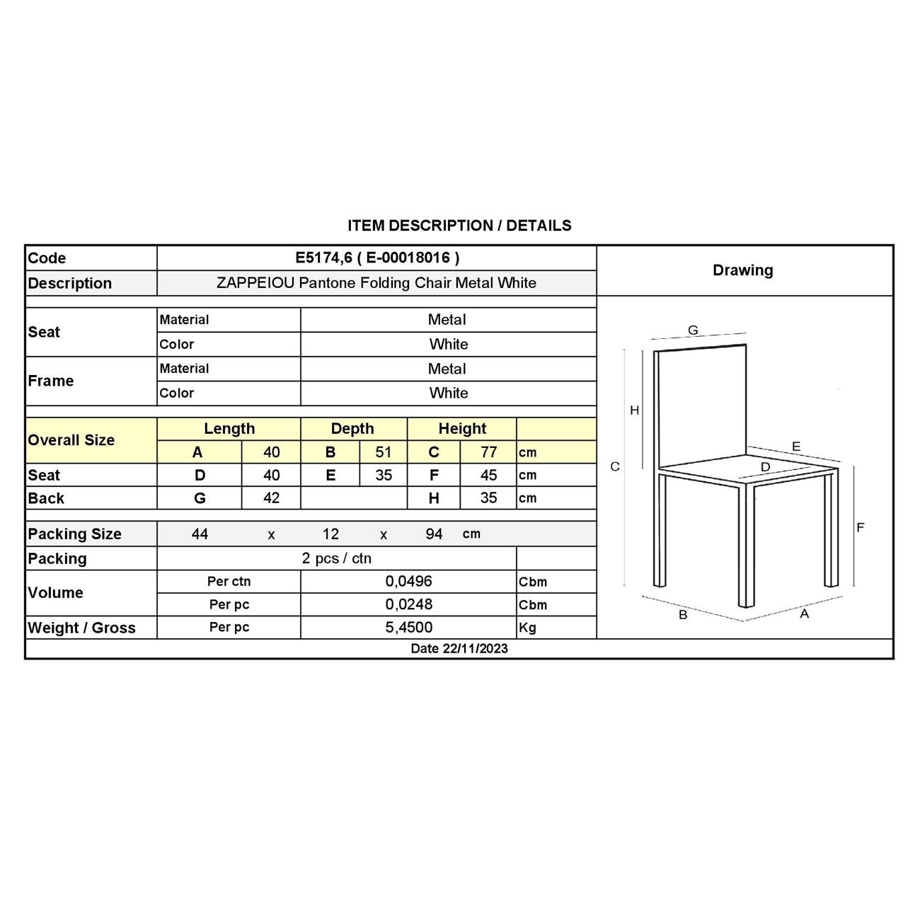 ΖΑΠΠΕΙΟΥ Pantone Καρέκλα Κήπου-Βεράντας, Πτυσσόμενη, Μέταλλο Βαφή Άσπρο (Ε-00018016)