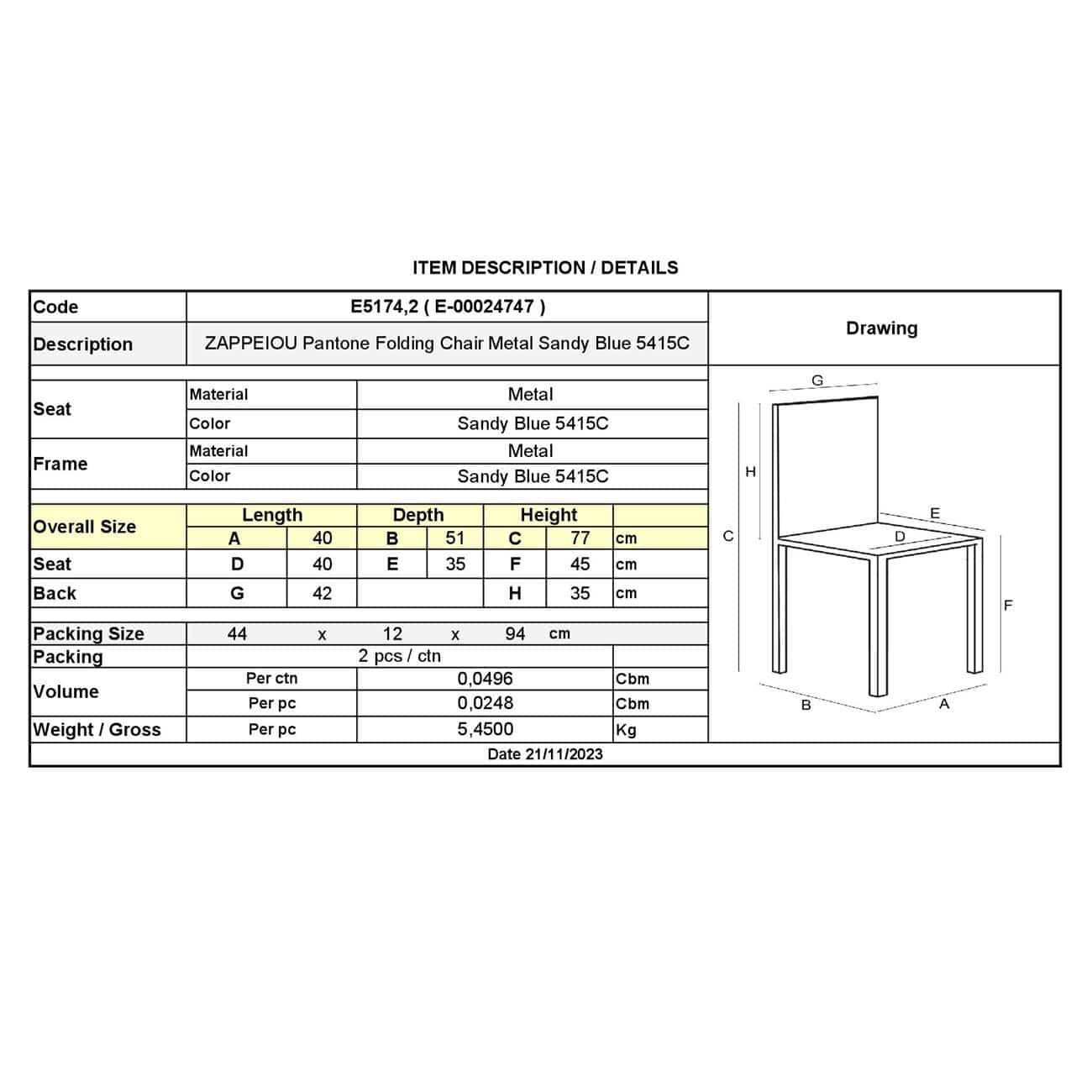ΖΑΠΠΕΙΟΥ Pantone Καρέκλα Κήπου-Βεράντας, Πτυσσόμενη, Μέταλλο Βαφή Sandy Blue 5415C 40x51x77cm