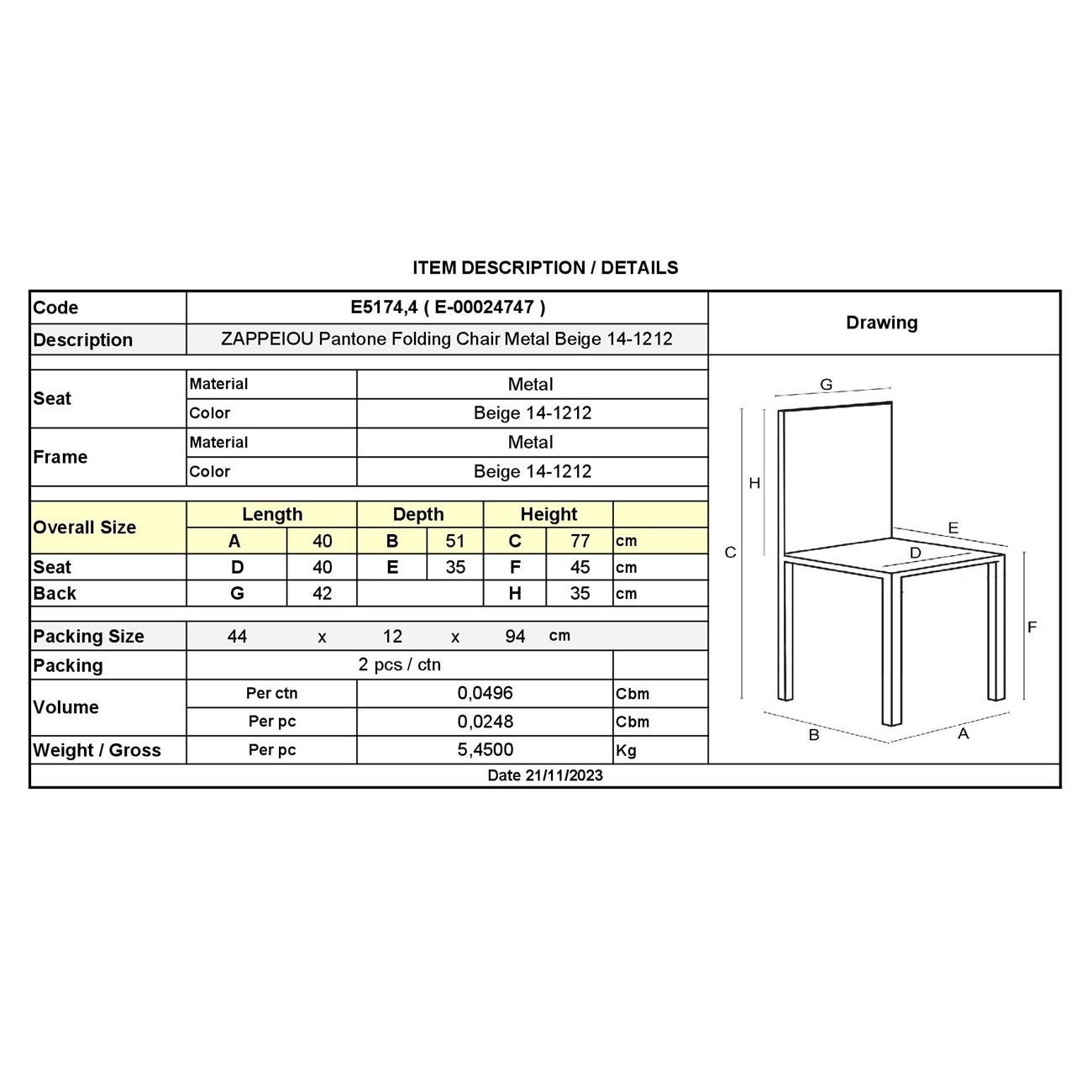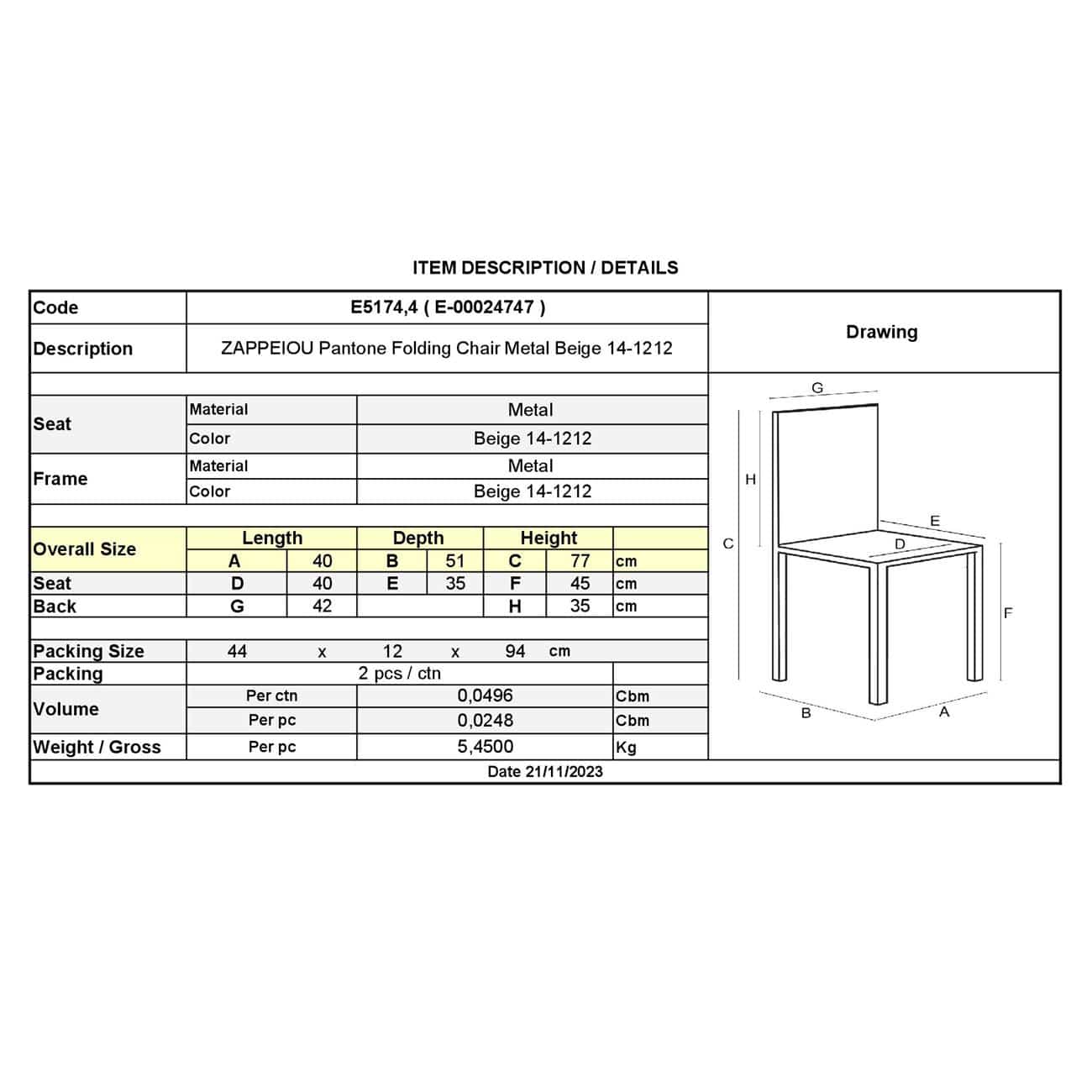 ΖΑΠΠΕΙΟΥ Pantone Καρέκλα Κήπου-Βεράντας, Πτυσσόμενη, Μέταλλο Βαφή Beige 14-1212 40x51x77cm
