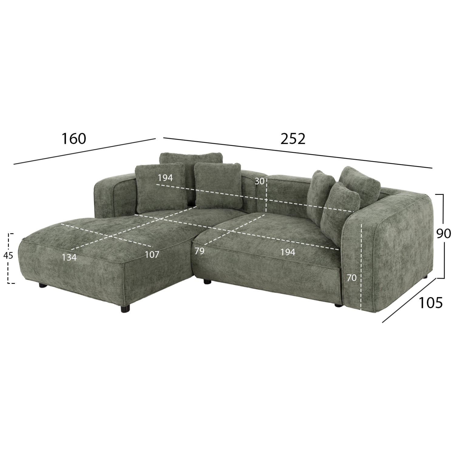 ΚΑΝΑΠΕΣ ΓΩΝΙΑ (ΑΡΙΣΤΕΡΗ) 3-ΘΕΣΙΟΣ GRACE HM3280.05L ΠΡΑΣΙΝΟ ΥΦΑΣΜΑ 252x160x70-90Υεκ HM3280.05L