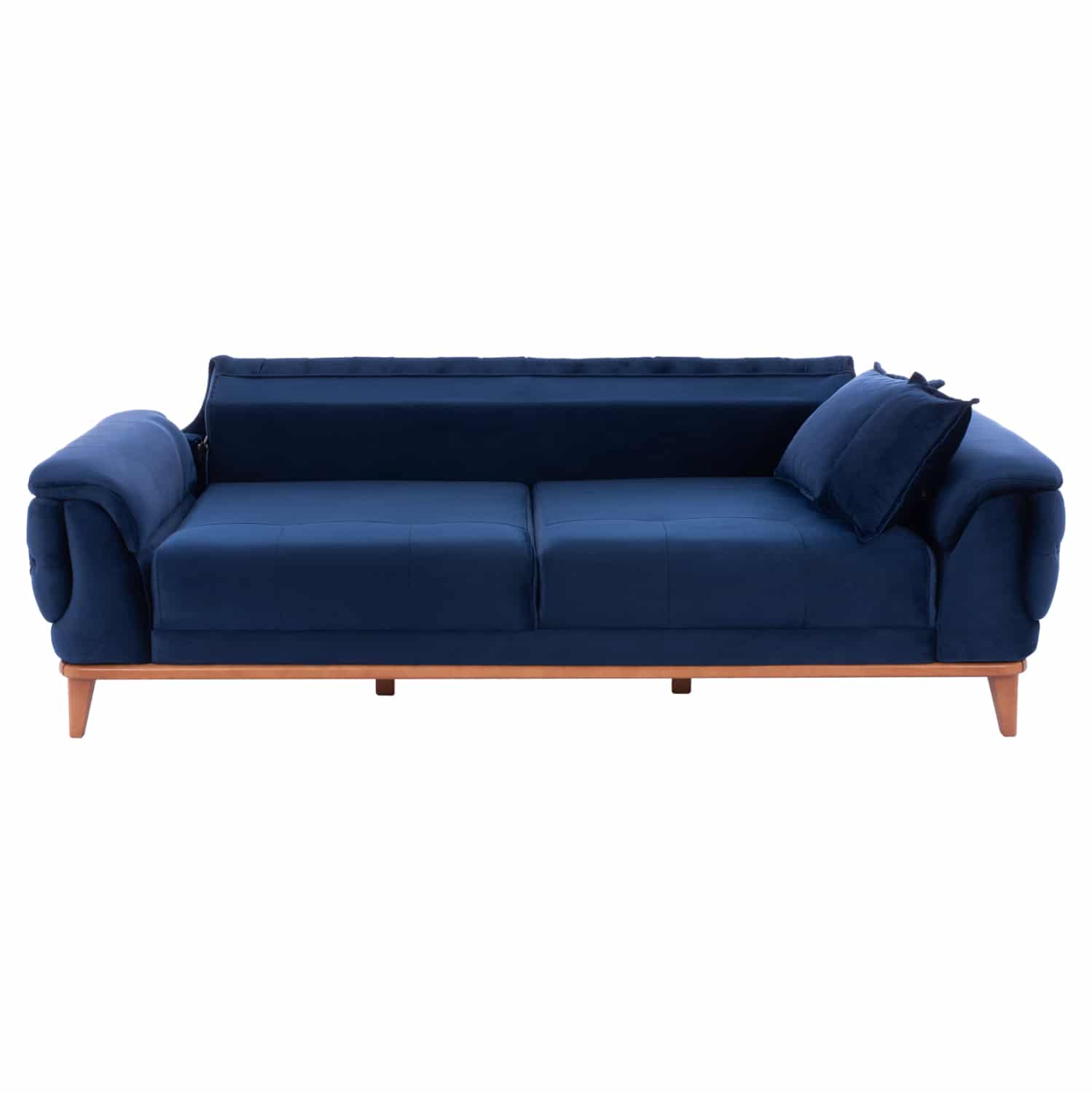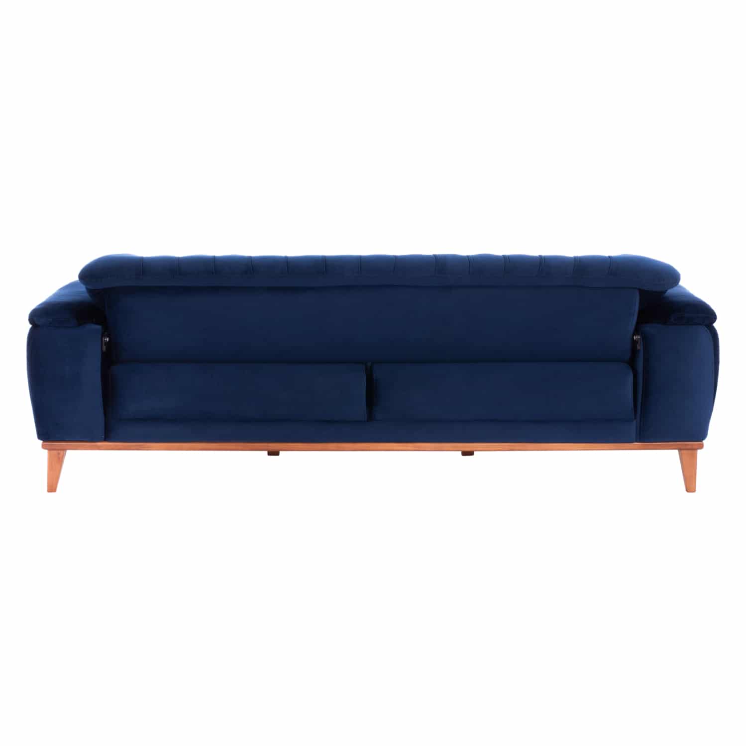 Αλλά δεν είναι μόνο το χρώμα και το καπιτονέ που κάνουν αυτόν τον καναπέ να ξεχωρίζει. Τα πόδια είναι ψηλά και ακριβώς πάνω από τα πόδια υπάρχει ένα ξύλινο πλαίσιο που διατρέχει ολόκληρο τον καναπέ, σε φυσικό χρώμα ξύλου, με αποτέλεσμα να δημιουργείται μια πανέμορφη διχρωμία με το έντονο μπλε της επένδυσης.