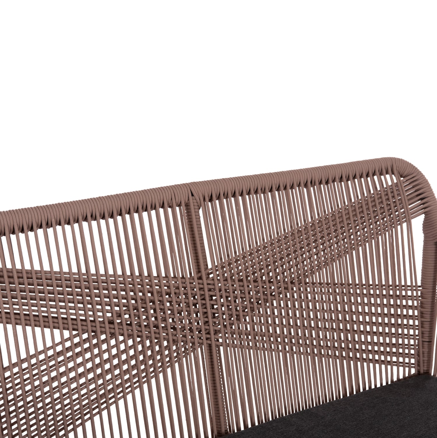 Ο 2-θέσιος καναπές εξωτερικού χώρου MYRTIA είναι εξαιρετικός και συνδυάζει τον σκελετό αλουμινίου σε ΑΝΘΡΑΚΙ χρώμα με το ΜΠΕΖ Teslin σχοινί που διατρέχει πλεγμένο όλο τον καναπέ. Το μαξιλάρι καθίσματος είναι επενδυμένο με πολυεστερικό ύφασμα σε ΑΝΘΡΑΚΙ χρώμα. Χαρακτηριστικό γνώρισμα αυτού του καναπέ είναι ότι τα πόδια είναι ψηλά, με αποτέλεσμα και το ύψος του καθίσματος να είναι ψηλό.