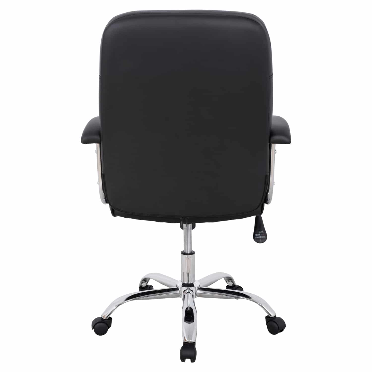 Διευθυντική καρέκλα γραφείου “RYLIE” σε μαύρο χρώμα. Μια «πλούσια» καρέκλα γραφείου με ψηλά μπράτσα με ελαφριά κλίση, επενδυμένα με μια λεπτή στρώση αφρολέξ σε PU δέρμα. Η πλάτη είναι ημίψηλη με πλούσια στρώση από αφρώδη υλικά για άνεση κατά την χρήση και υποστηρίζει ολόκληρο τον κορμό σας, ενώ είναι επενδυμένη με υψηλής ποιότητας PU δέρμα, όπως επίσης και το αναπαυτικό κάθισμα. Η βάση είναι χρωμιωμένη σε σχήμα «αστέρι» με κυρτά πόδια και μαύρα ροδάκια.