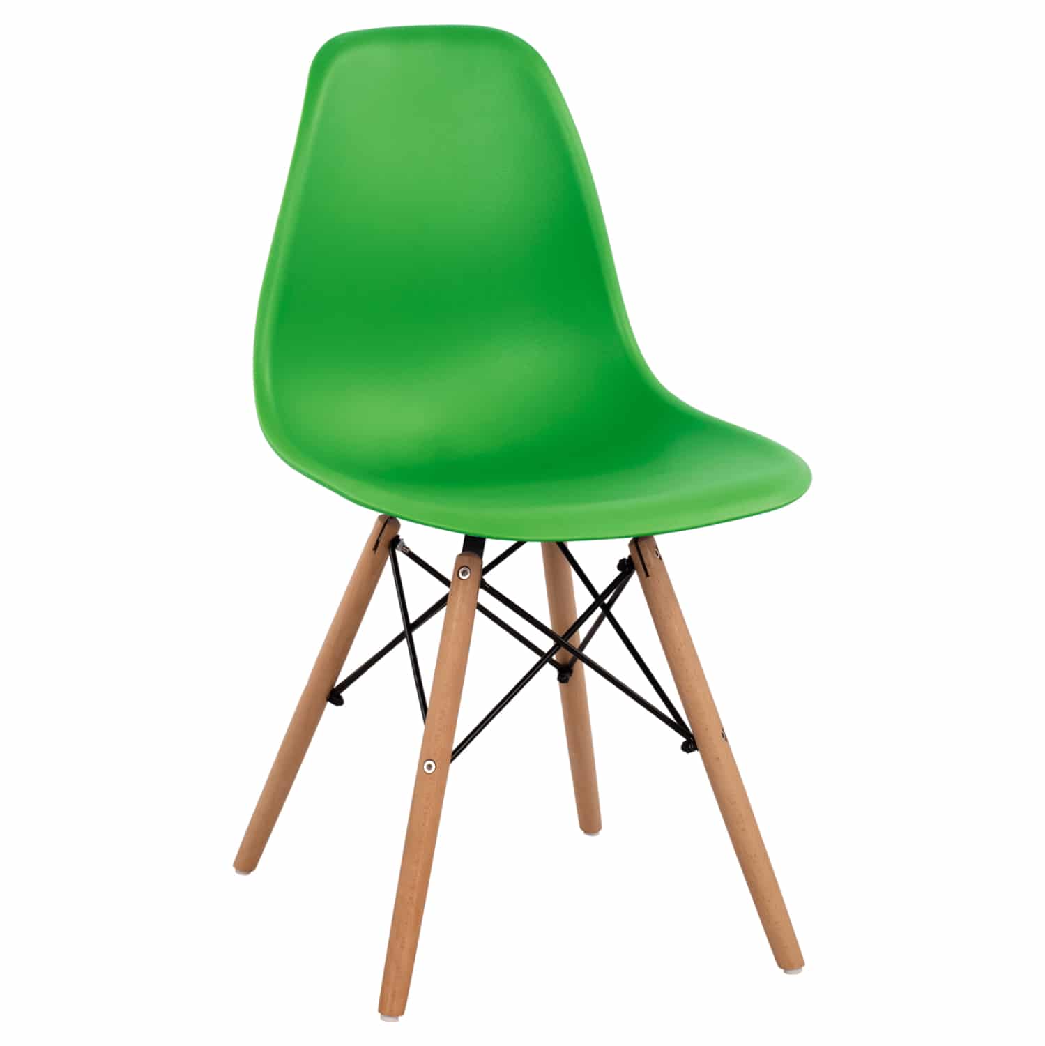 Μία μοντέρνα καρέκλα κατασκευασμένη από ξύλινο σκελετό και κάθισμα πολυπροπυλενίου σε λαχανί απόχρωση.
