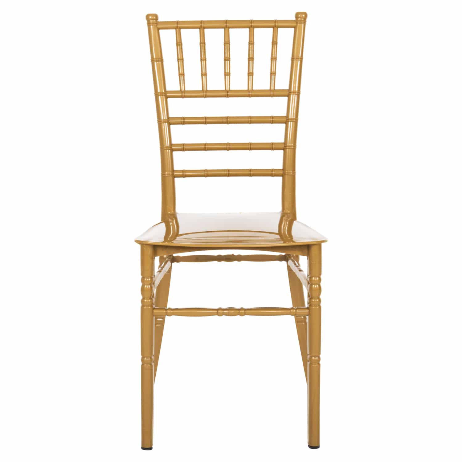 Καρέκλα TIFFANY σε ΧΡΥΣΟ χρώμα. Ιδανική πρόταση για χρήση σε επαγγελματικούς χώρους (χώροι δεξιώσεων, εταιρείες catering, κλπ.). Η καρέκλα διαθέτει λεπτομέρειες τόσο στις οριζόντιες όσο και στις κάθετες δοκούς της πλάτης, αλλά και στα πόδια. Φυσικά, μια τέτοια καρέκλα είναι και ΣΤΟΙΒΑΖΟΜΕΝΗ πράγμα που την κάνει ιδιαιτέρως πρακτική.