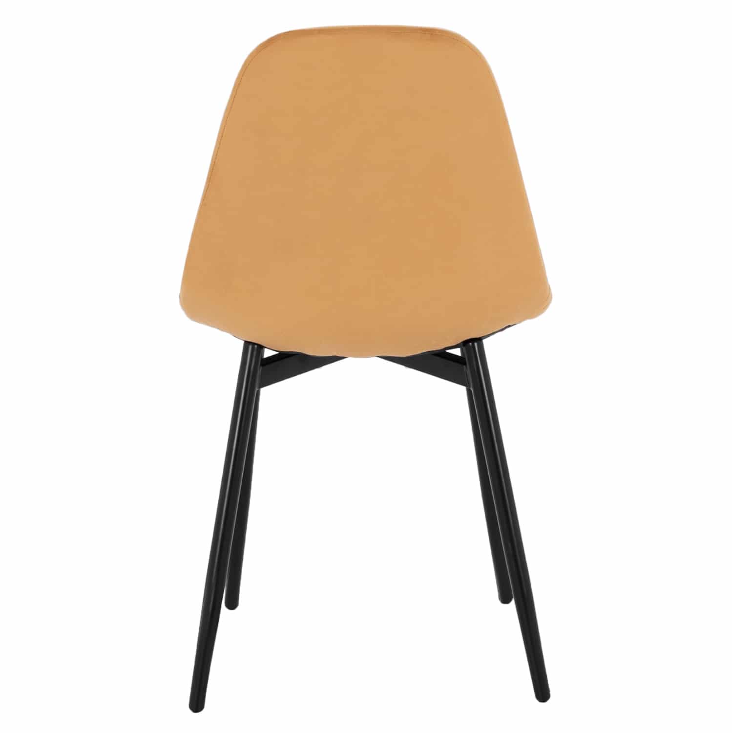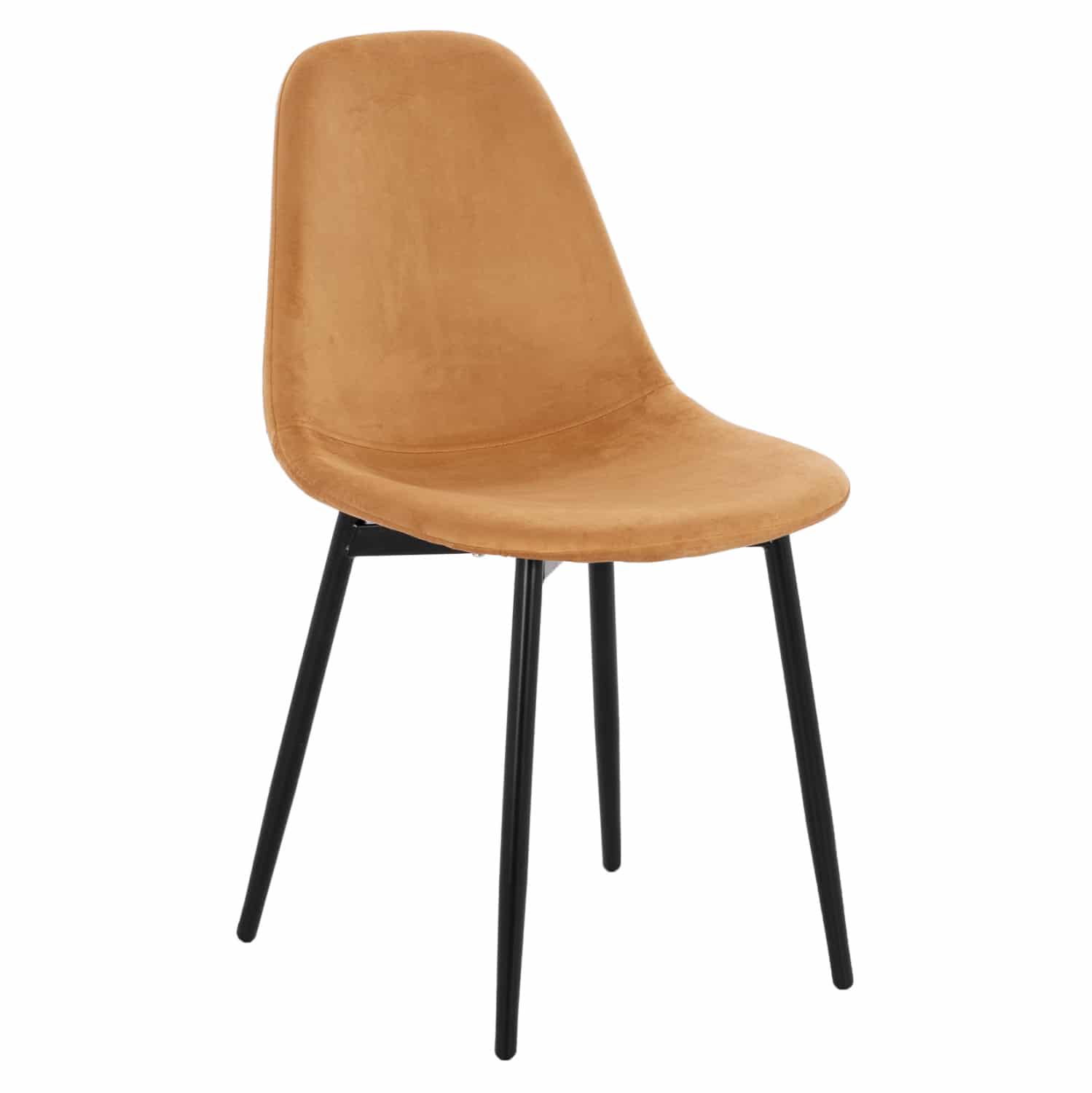 Το κάθισμα της καρέκλας είναι επενδυμένο με ύφασμα από βελούδο σε χρυσή απόχρωση. Τα πόδια είναι μεταλλικά για μεγαλύτερη αντοχή, βαμμένα σε μαύρο χρώμα.