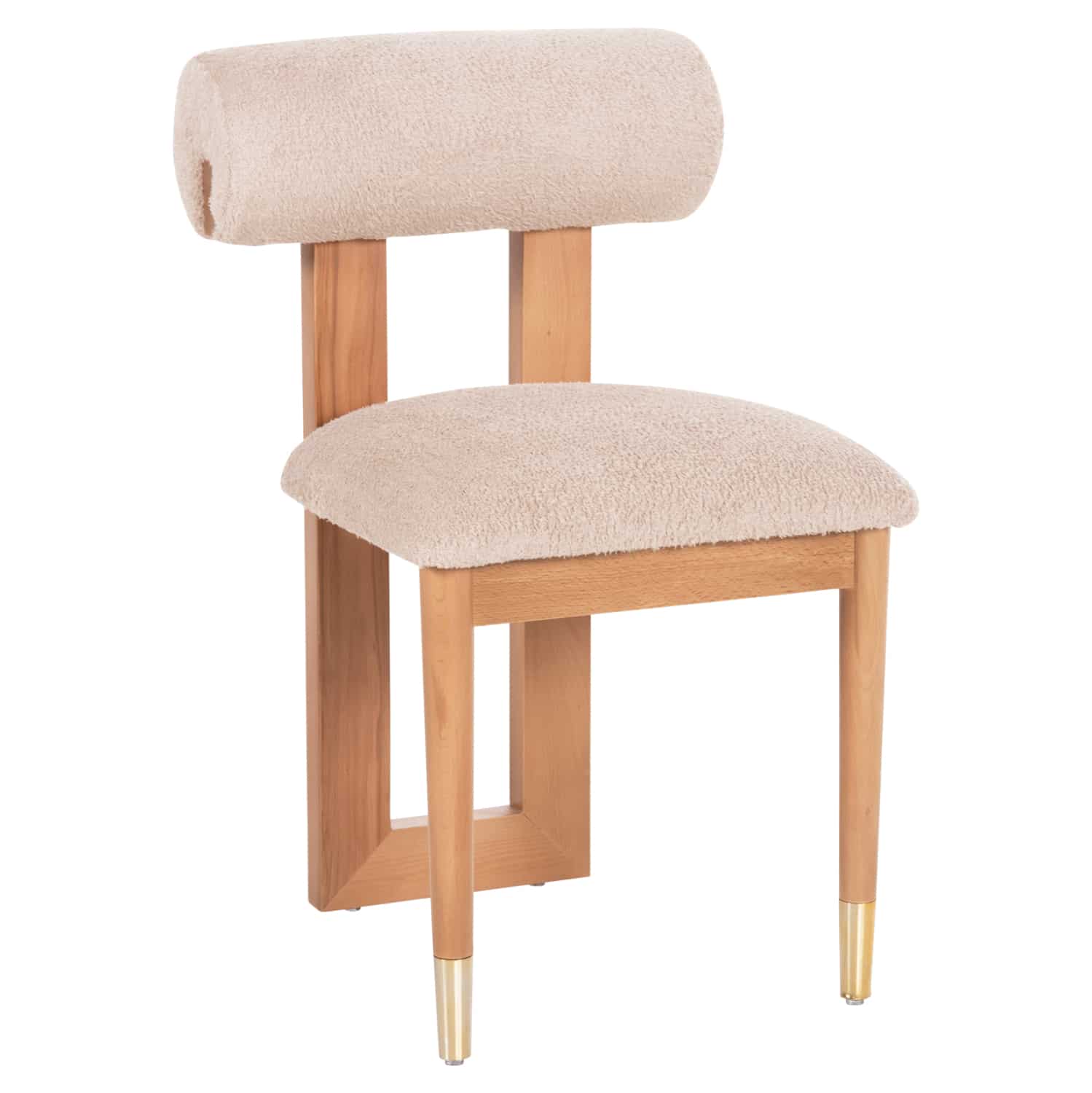 H καρέκλα TONDELLA είναι μια πολυτελής πρόταση για την τραπεζαρία σας. Διαθέτει μοντέρνο design που ενώνει με αριστοτεχνικό τρόπο υλικά και χρώματα δημιουργώντας ένα πανέμορφο αποτέλεσμα. Το ξύλο που χρησιμοποιείται είναι η οξιά στο ΦΥΣΙΚΟ της χρώμα, ενώ τόσο το κάθισμα όσο και η πλάτη είναι επενδυμένα με ζεστό μπουκλέ ύφασμα σε ΜΠΕΖ χρώμα. Η εικόνα ολοκληρώνεται με μεταλλικές ΧΡΥΣΕΣ «πινελιές» στο κάτω μέρος των εμπρός ποδιών.