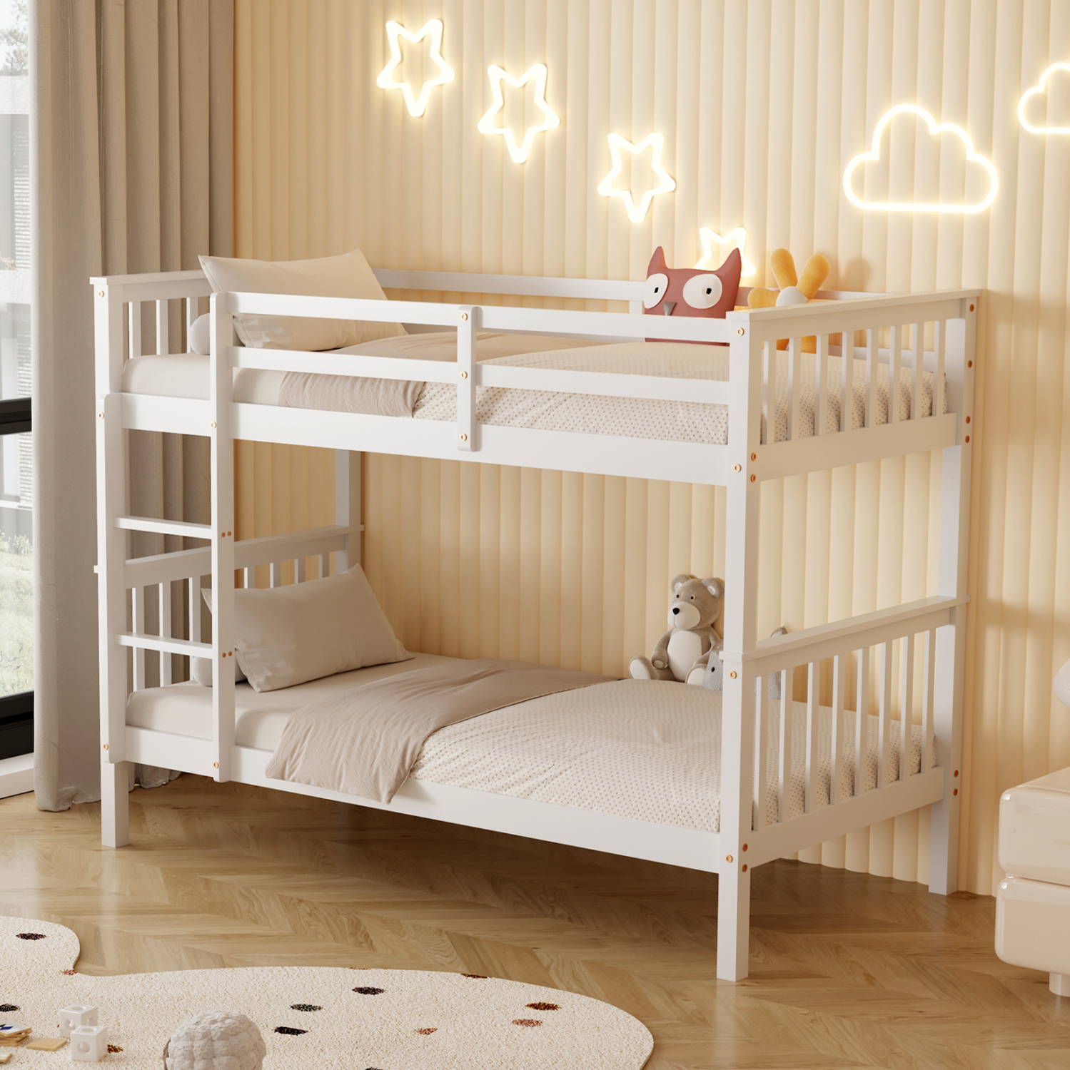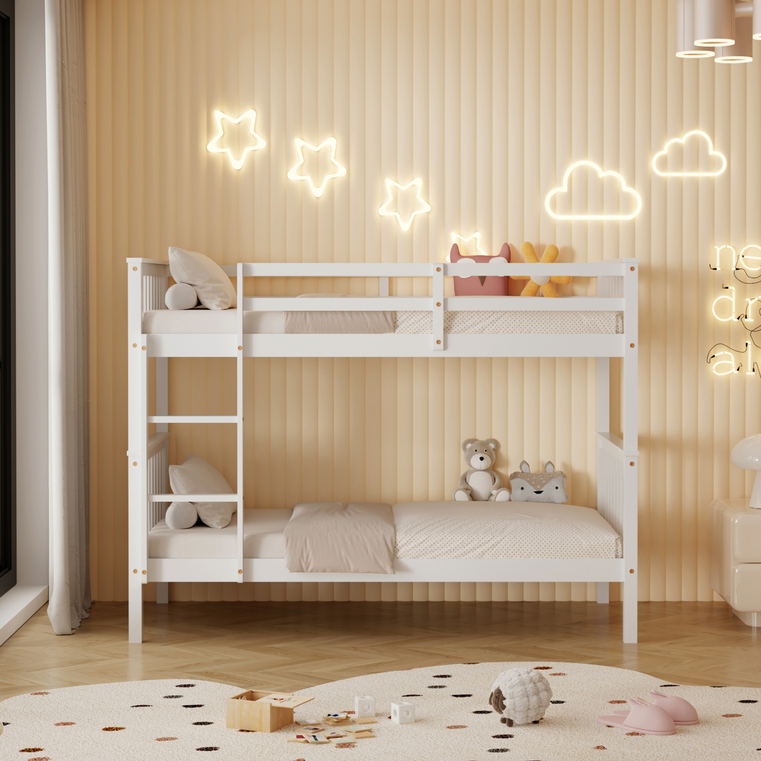 Η παιδική κουκέτα LANTAI σε διάσταση για στρώματα 90×190εκ, είναι κατασκευασμένη από ξύλο πεύκου σε ΛΕΥΚΟ χρώμα. Η κουκέτα με τα ψηλά σχετικά πόδια, διαθέτει περιμετρικά κάγκελα και σκάλα πρόσβασης στο επάνω κρεβάτι, ενώ τα στρώματα τοποθετούνται σε τάβλες από κόντρα-πλακέ ξυλεία.