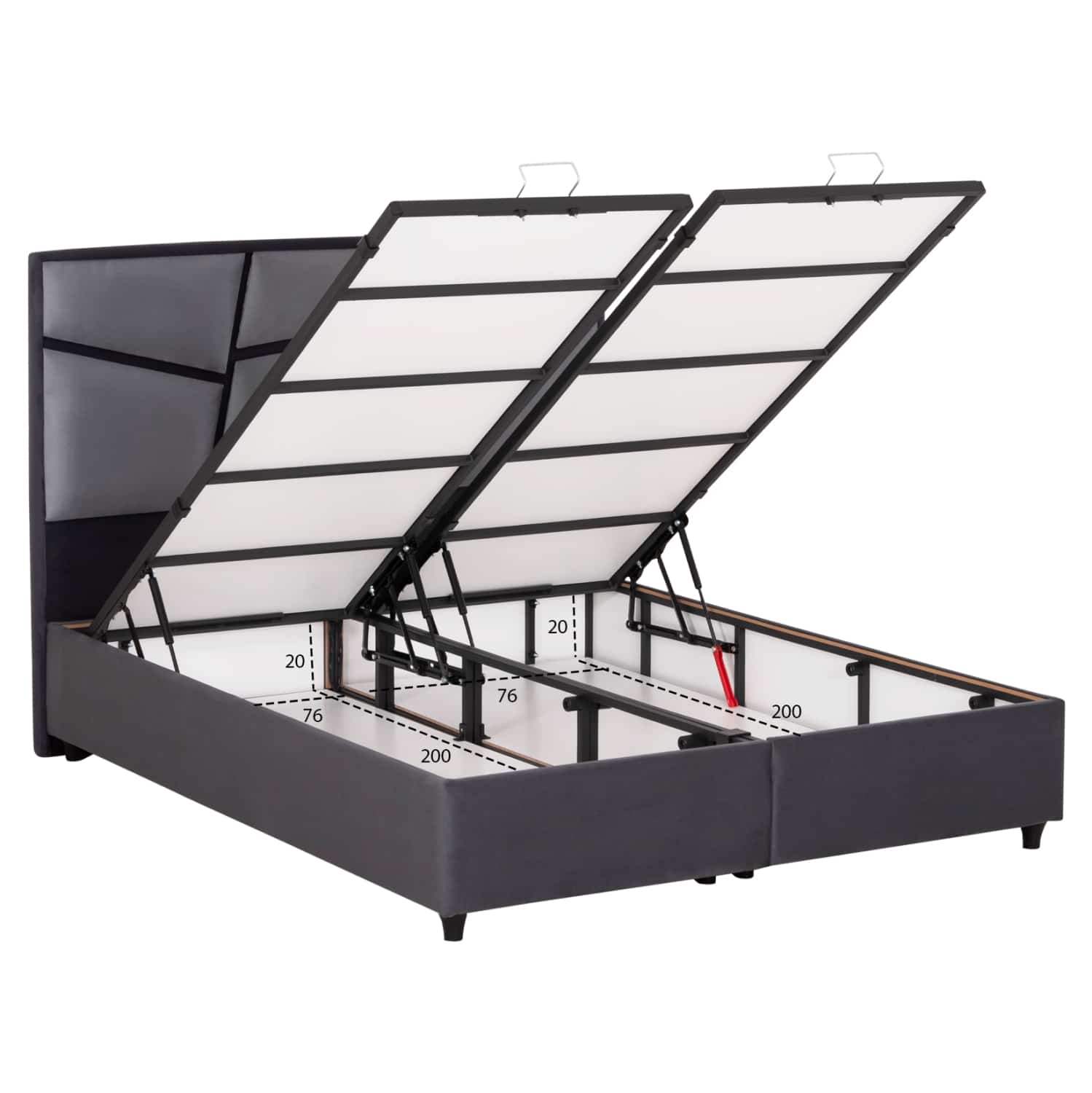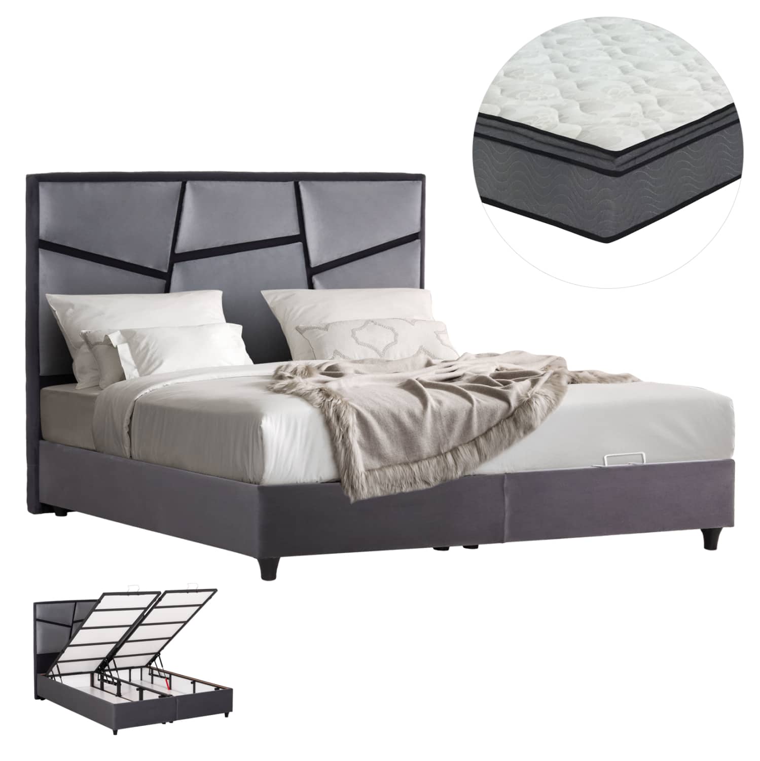Το υπέρδιπλο κρεβάτι IRIDA είναι επενδυμένο με ΓΚΡΙ βελούδο και ειδικά το κεφαλάρι έχει όμορφο σχέδιο με το βελούδινο ύφασμα. Το στρώμα τοποθετείται σε μια συνεχόμενη επιφάνεια (2 μοριοσανίδες), και επιπλέον, η κάθε επιφάνεια από μοριοσανίδα ανασηκώνεται με μεταλλικό μηχανισμό ασφαλείας και μεταλλικές λαβές προσφέροντας έναν μεγάλο αποθηκευτικό χώρο.