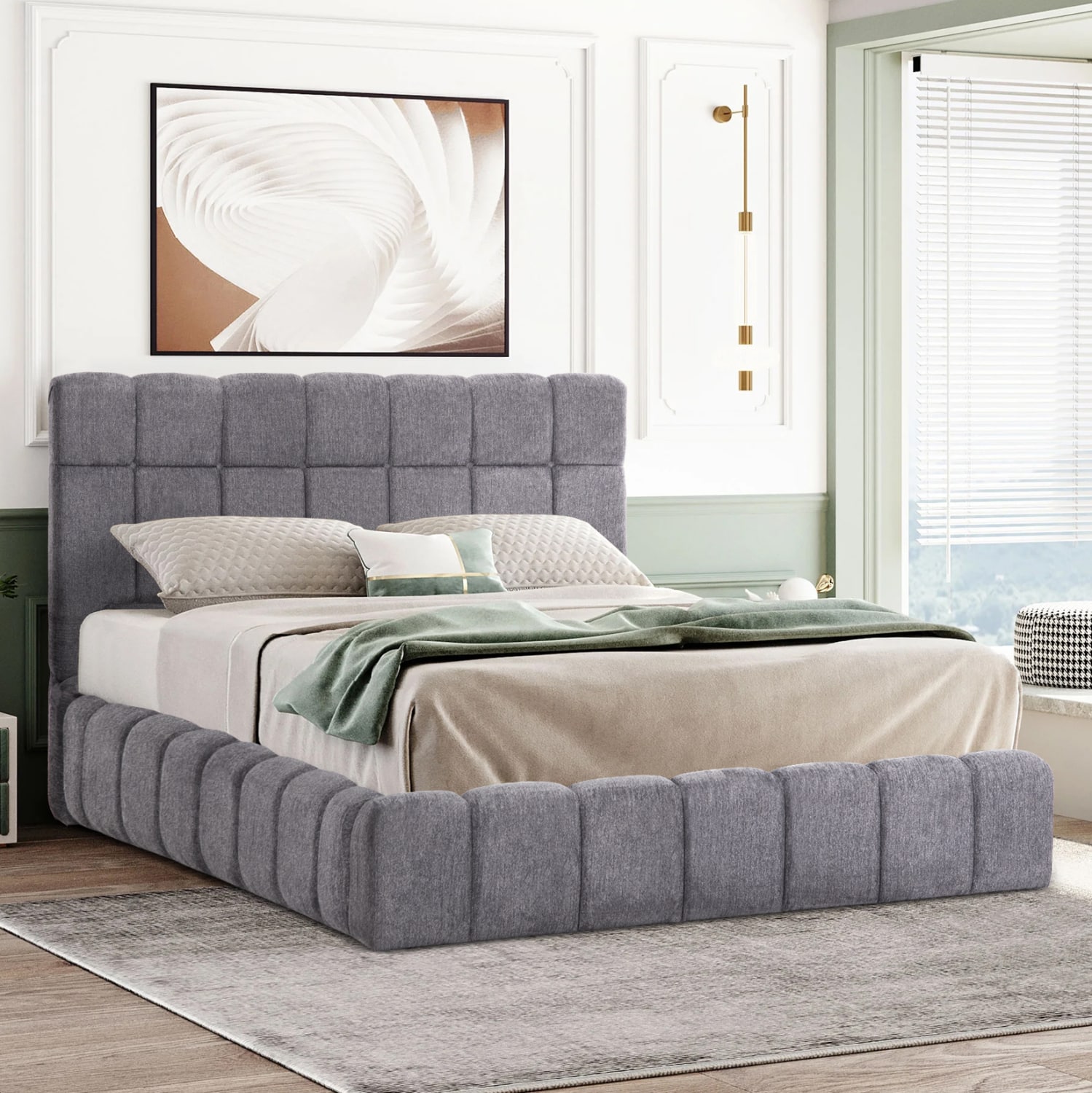 Το RΑΜΟΝ είναι ένα υπέρδιπλο κρεβάτι που θα αγαπήσετε με την πρώτη ματιά! Το κεφαλάρι είναι ψηλό με τεχνοτροπία καπιτονέ από «ζεστό» και εντυπωσιακό ύφασμα μπουκλέ σε ΓΚΡΙ χρώμα. Τα πλαϊνά του κρεβατιού αλλά και το ποδαρικό είναι ίδιας αισθητικής με το κεφαλάρι και «αγκαλιάζουν» το στρώμα! Το στρώμα τοποθετείται σε δύο υποστρώματα/μοριοσανίδες, οι οποίες μάλιστα ανασηκώνονται με μεταλλικό μηχανισμό ασφαλείας με 4 αμορτισέρ και διαφανείς πλαστικές λαβές προσφέροντας έναν μεγάλο αποθηκευτικό χώρο.