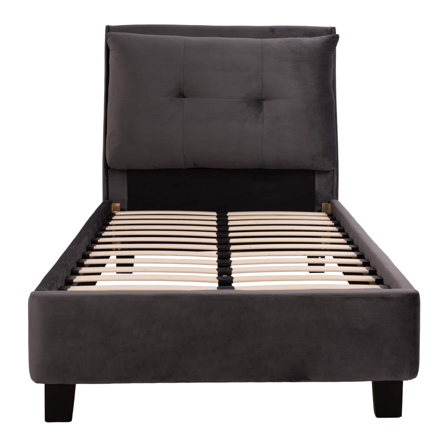 Το μονό κρεβάτι RILEY είναι επενδυμένο με βελούδο σε ΓΚΡΙ χρώμα. Το στρώμα (διατίθεται σε ROLL-PACKING*) που συνοδεύει το κρεβάτι τοποθετείται σε δύο σειρές ανατομικές τάβλες, είναι διπλής όψης και είναι ΑΦΡΟΥ χωρίς ελατήρια. Τα πόδια είναι σχετικά ψηλά από πολυπροπυλένιο σε μαύρο χρώμα.