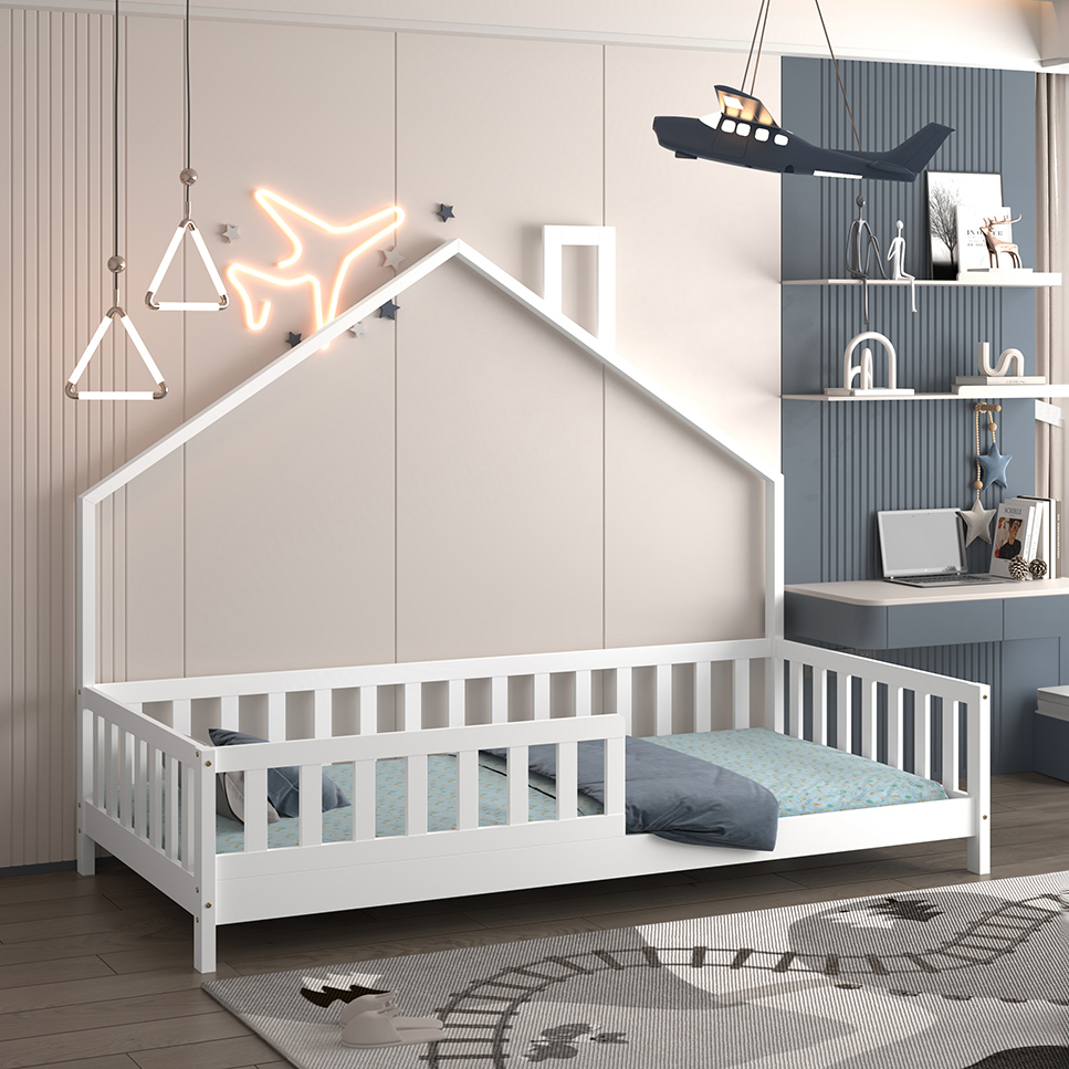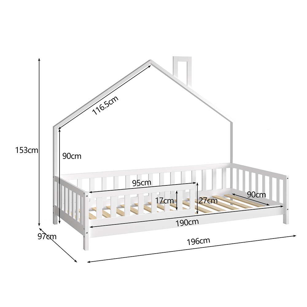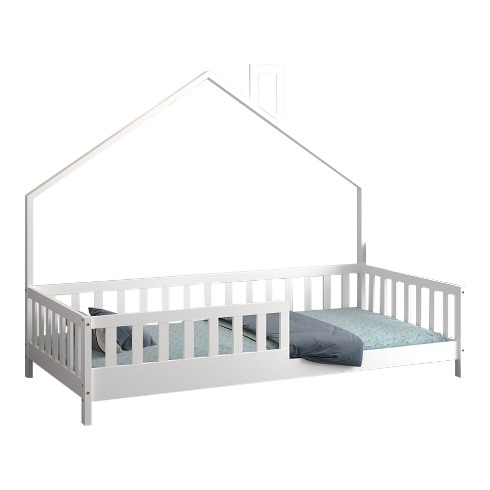Σας παρουσιάζουμε το καινούργιο παιδικό κρεβάτι HOUSER. Είναι σε διάσταση για μονό στρώμα 90×190 εκ, και αποτελεί μια άριστης ποιότητας, κλασική και ασφαλή επιλογή για το παιδικό δωμάτιο μιας και είναι τύπου Montessori, που σημαίνει ότι έχει σχεδιαστεί σύμφωνα με το εκπαιδευτικό σύστημα Montessori, σύμφωνα με το οποίο τα παιδιά μαθαίνουν καλύτερα, όταν επιλέγουν μόνα τους τι θα κάνουν. Το χαμηλό ύψος κρεβατιού με τα χαμηλά πόδια, βοηθά να εξερευνούν την αυτονομία τους και να ανεβοκατεβαίνουν από το κρεβάτι τους ελεύθερα ανά πάσα στιγμή. Είναι ξύλινο σε ΛΕΥΚΟ χρώμα βαμμένο με αβλαβές μη τοξικό βερνίκι με βάση το νερό, ιδανικό για παιδιά. Το στρώμα τοποθετείται σε τάβλες κατασκευασμένες από ξυλεία κόντρα πλακέ. Η μία πλευρά του κρεβατιού έχει την φιγούρα σπιτιού με καμινάδα που θα δώσει μια ευχάριστη, «ζεστή», και παιχνιδιάρικη όψη σε κάθε παιδικό δωμάτιο, ενώ διαθέτει κάγκελα περιμετρικά.