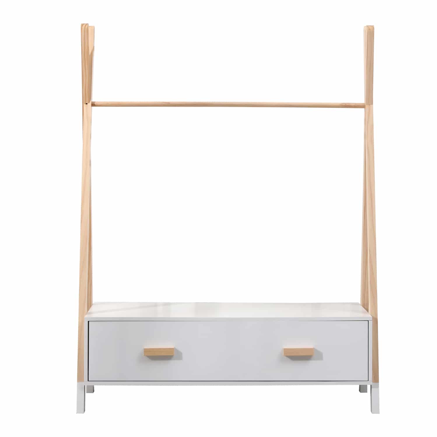 Σας παρουσιάζουμε την καινούργια παιδική ανοιχτή κρεμάστρα PASCHAL. Είναι βολική σε διαστάσεις και διαθέτει μία μπάρα κρέμασης ρούχων και 2 πρακτικά συρτάρια στο κάτω μέρος, σε ΛΕΥΚΟ χρώμα. Στηρίζεται σε δύο ξύλινα χιαστί πόδια σε ΦΥΣΙΚΟ χρώμα ξύλου στις δύο πλευρές. Είναι βαμμένη με αβλαβές βερνίκι με βάση το νερό και μη τοξικό, ιδανικό για παιδιά.