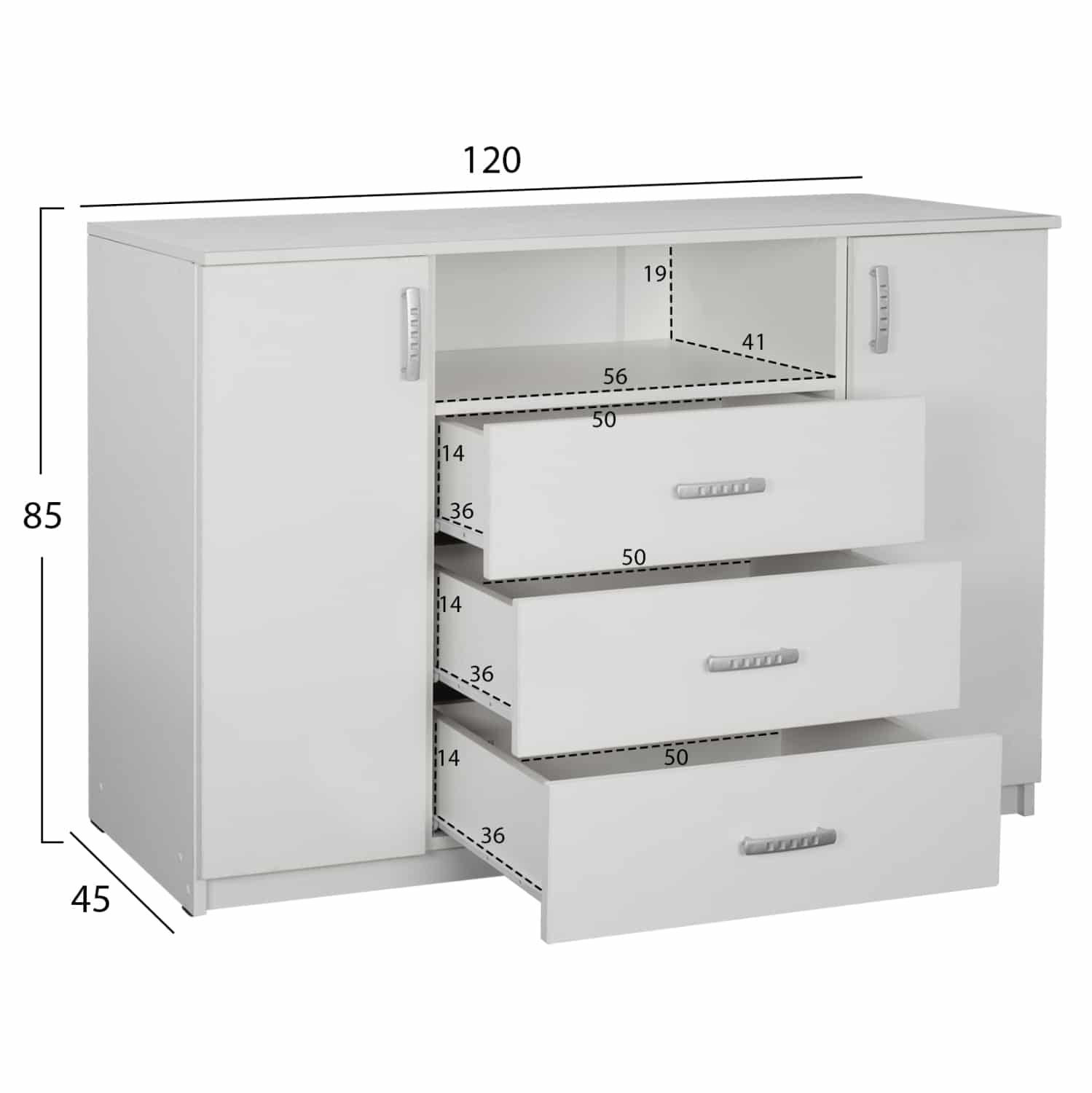 Διαθέτει τρία συρτάρια, δύο ντουλάπια και μία ανοικτή επιφάνεια, για να αποθηκεύετε μικρά αντικείμενα.
