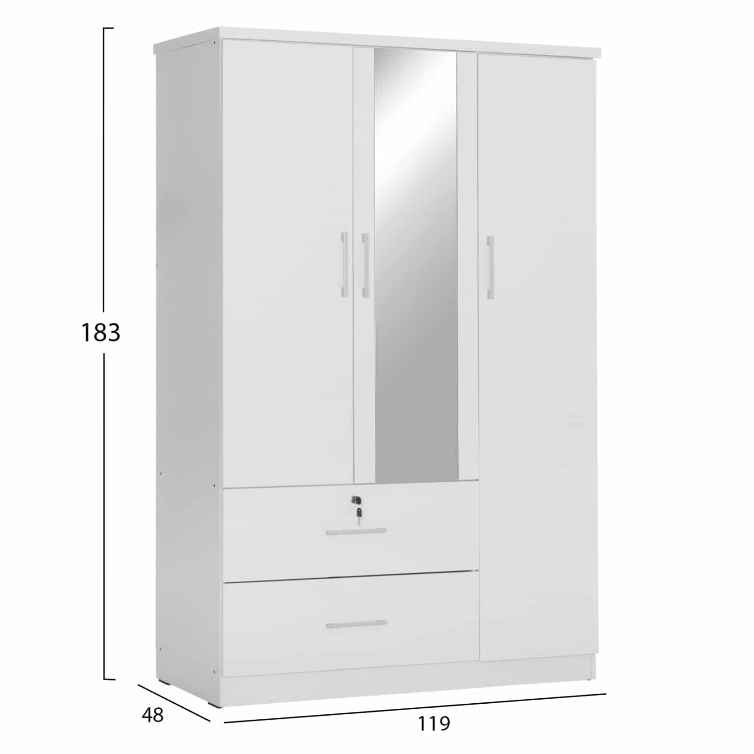 Η τρίφυλλη ντουλάπα JARRY είναι μια πρακτικότατη ντουλάπα που έχει φτιαχτεί με γνώμονα την όσο το δυνατόν καλύτερη εκμετάλλευση του χώρου. Έχει 3 πόρτες, αλλά με απροσδόκητα άνετους χώρους στο εσωτερικό της. Η πλευρά με την διπλή πόρτα διαθέτει καθρέπτη στην μία πόρτα και μια μεταλλική μπάρα για κρέμαση ρούχων στο εσωτερικό, ενώ στο κάτω μέρος υπάρχουν 2 συρτάρια, ένα εκ των οποίων διαθέτει κλειδαριά. Η πλευρά με την μονή πόρτα διαθέτει 4 ράφια (5 αποθηκευτικοί χώροι). Είναι κατασκευασμένη από μελαμίνη σε ΛΕΥΚΟ χρώμα και αισθητικά μπορεί να ταιριάξει με πολλά άλλα στυλ, χάρη και στις «καθαρές» γραμμές της.