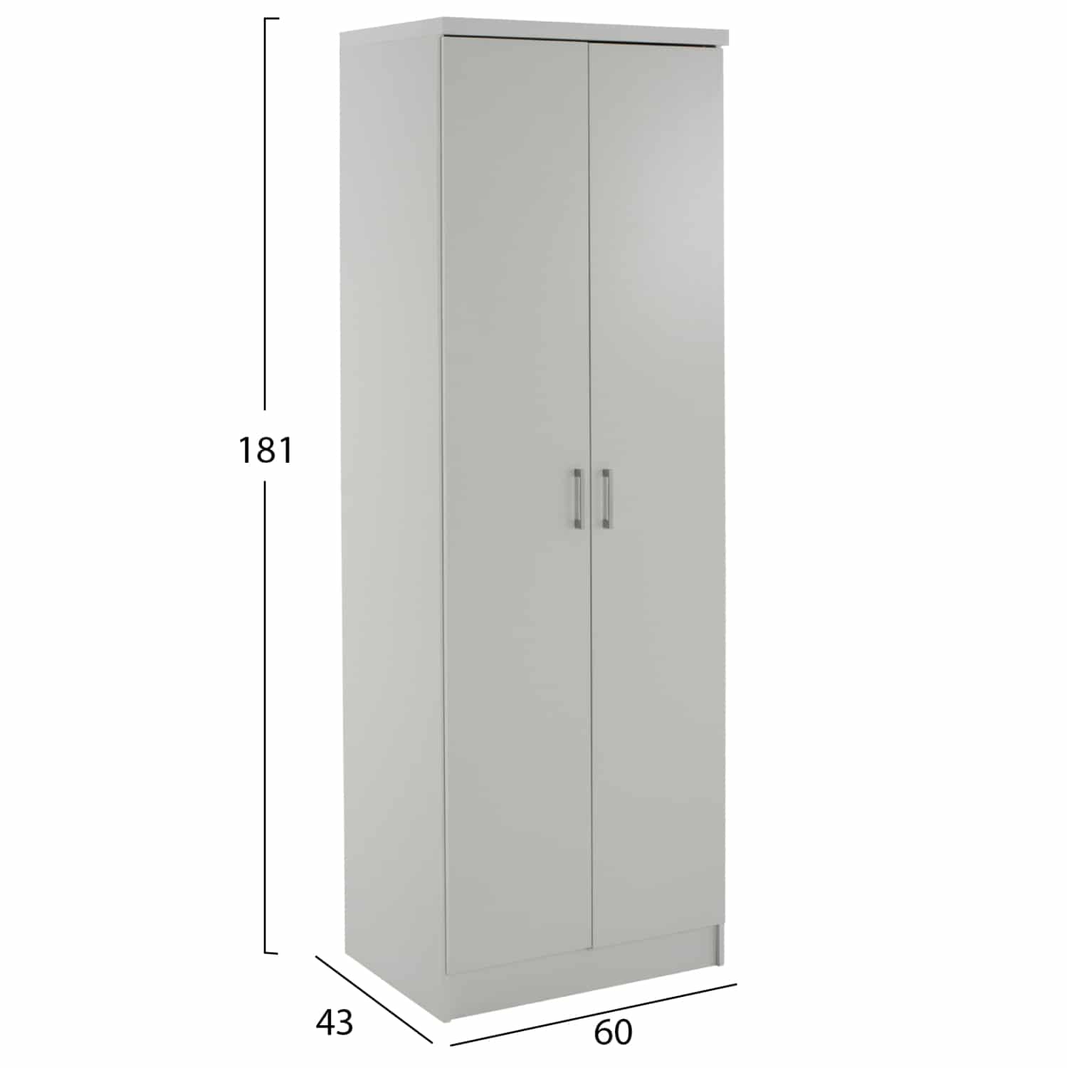 ΗΜ337.05-Ντουλάπα—Γνωρίστε την δίφυλλη ντουλάπα BAILEY. Πρόκειται για μια πρακτικότατη ντουλάπα που έχει φτιαχτεί με γνώμονα την όσο το δυνατόν καλύτερη εκμετάλλευση του χώρου. Είναι μια στενή σχετικά ντουλάπα με 2 πόρτες, αλλά με απροσδόκητα άνετους χώρους στο εσωτερικό της, το οποίο διαθέτει 3 ράφια και μια μεταλλική μπάρα για κρέμαση. Είναι κατασκευασμένη από μελαμίνη σε ΛΕΥΚΟ χρώμα και αισθητικά μπορεί να ταιριάξει με πολλά άλλα στυλ, χάρη και στις «καθαρές» γραμμές της.