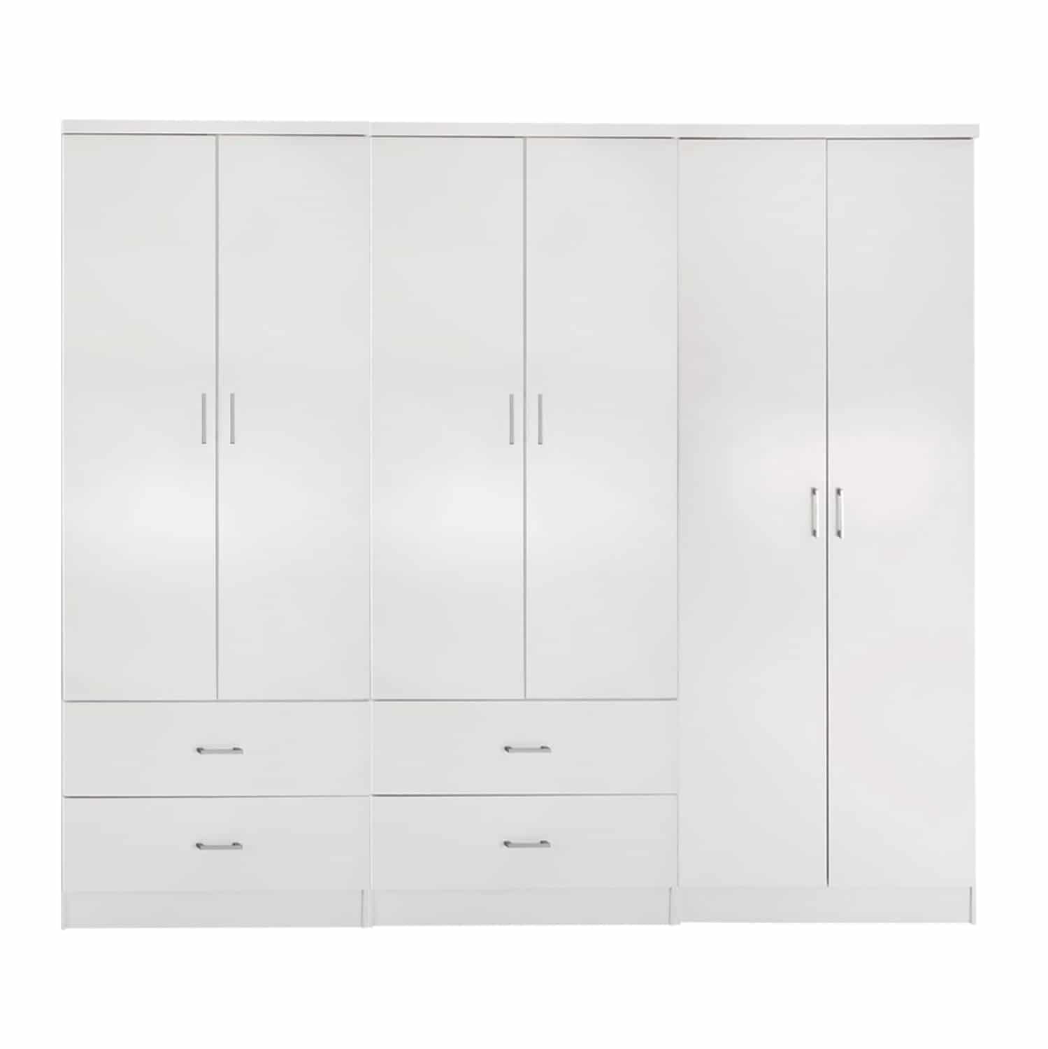 Γνωρίστε άλλη μία εκδοχή της ντουλάπας-γκαρνταρόμπας REINA. Πρόκειται για μια μεγάλη ντουλάπα με 6 πόρτες, χωρισμένη σε δύο μέρη. Η μία πλευρά διαθέτει μπάρα για κρέμαση ρούχων και 4 συρτάρια στο κάτω μέρος. Η άλλη πλευρά διαθέτει επίσης μπάρα για κρέμαση ρούχων και ένα ράφι πάνω από την μπάρα. Οι πόρτες αλλά και τα συρτάρια ανοίγουν με καλαίσθητα ασημί χερούλια. Είναι κατασκευασμένη από μελαμίνη σε ΛΕΥΚΟ χρώμα και αισθητικά μπορεί να ταιριάξει με πολλά άλλα στυλ, χάρη και στις «καθαρές» γραμμές της.