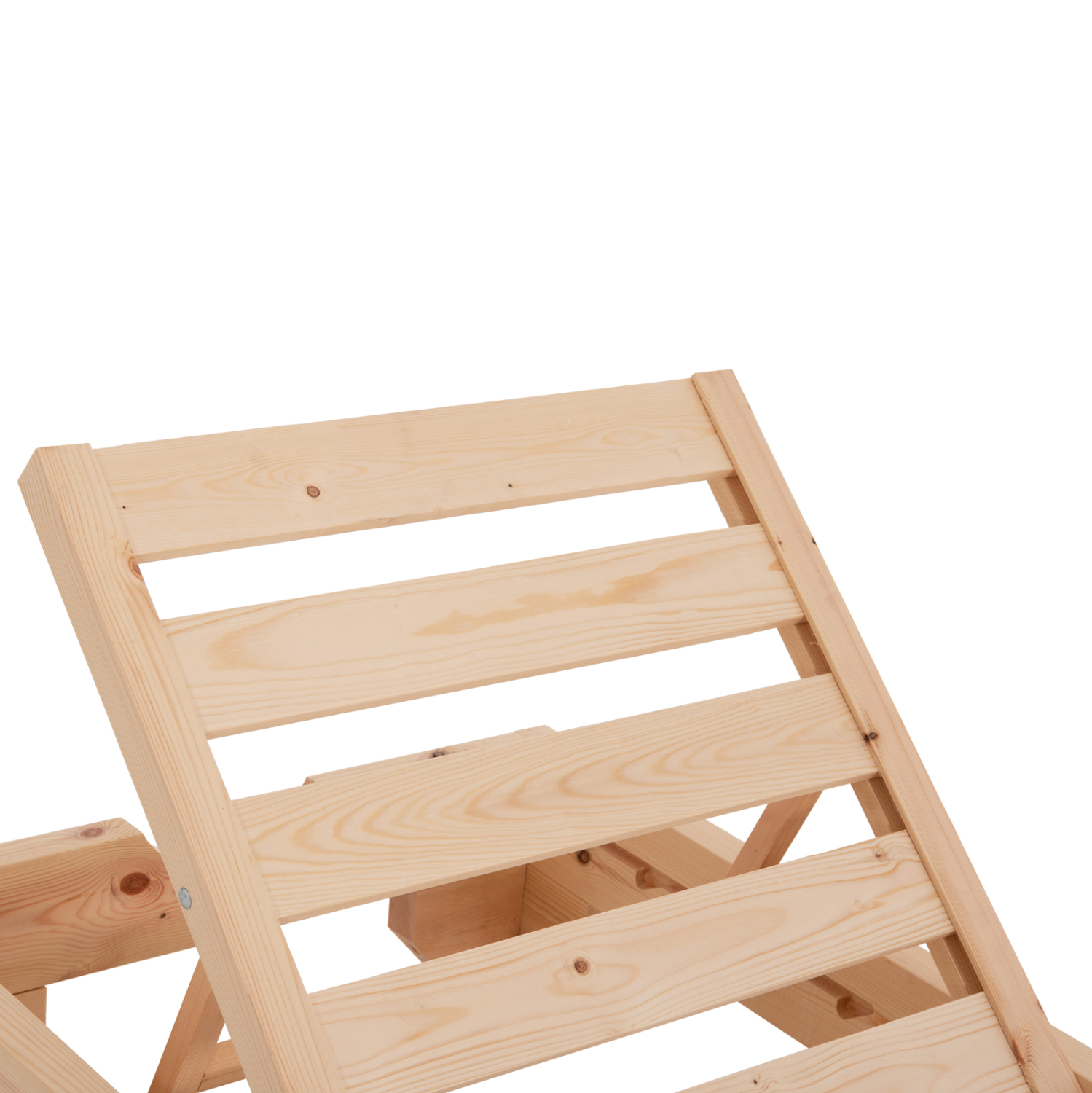 -Ολόκληρη η ξαπλώστρα έχει κατασκευαστεί από ξύλο πεύκου με εμποτισμό και επιπλέον στρώση με βερνίκι νερού. Το πεύκο είναι ένα μαλακό, λευκό ή ανοιχτό κίτρινο ξύλο το οποίο είναι ελαφρύ σε βάρος με ευθύγραμμα νερά ξύλου. Αντέχει στη συρρίκνωση, διόγκωση και κάμψη. Ο εμποτισμός υπό την ευρεία έννοια είναι ο χρωματισμός του ξύλου (συνήθως βερνίκια) με την μέθοδο της εμβάπτισης.
