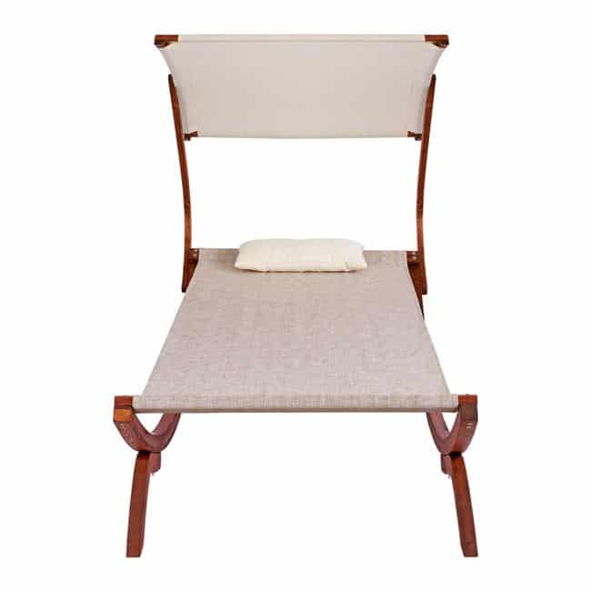 Κατασκευασμένη από ξύλο πεύκου σε καρυδί απόχρωση με textilene 2×2 και προσκέφαλο μπεζ.