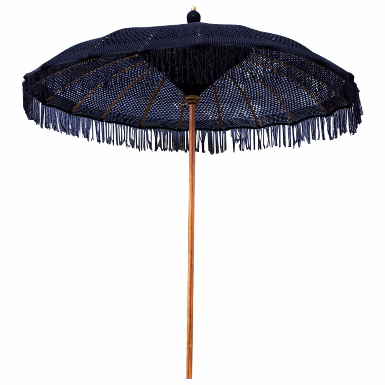 Η ομπρέλα πολυτελείας ΗΜ6035.03 είναι πραγματικά πανέμορφη. Ο στύλος της είναι από μασίφ ξύλο ΤΕΑΚ ενώ τα «μπράτσα» της ομπρέλας είναι από ξύλο BAMBOO. Το ιδιαίτερο χαρακτηριστικό, όμως, αυτής της εκπληκτικής ομπρέλας είναι ότι το σκίαστρό της είναι φτιαγμένο από μακραμέ σε ΜΑΥΡΟ χρώμα. Μια ομπρέλα που μπορεί να χρησιμοποιηθεί με πολλούς τρόπους κυρίως σε επαγγελματικούς χώρους και να προσφέρει με τις διαστάσεις της σκίαση με…στυλ!