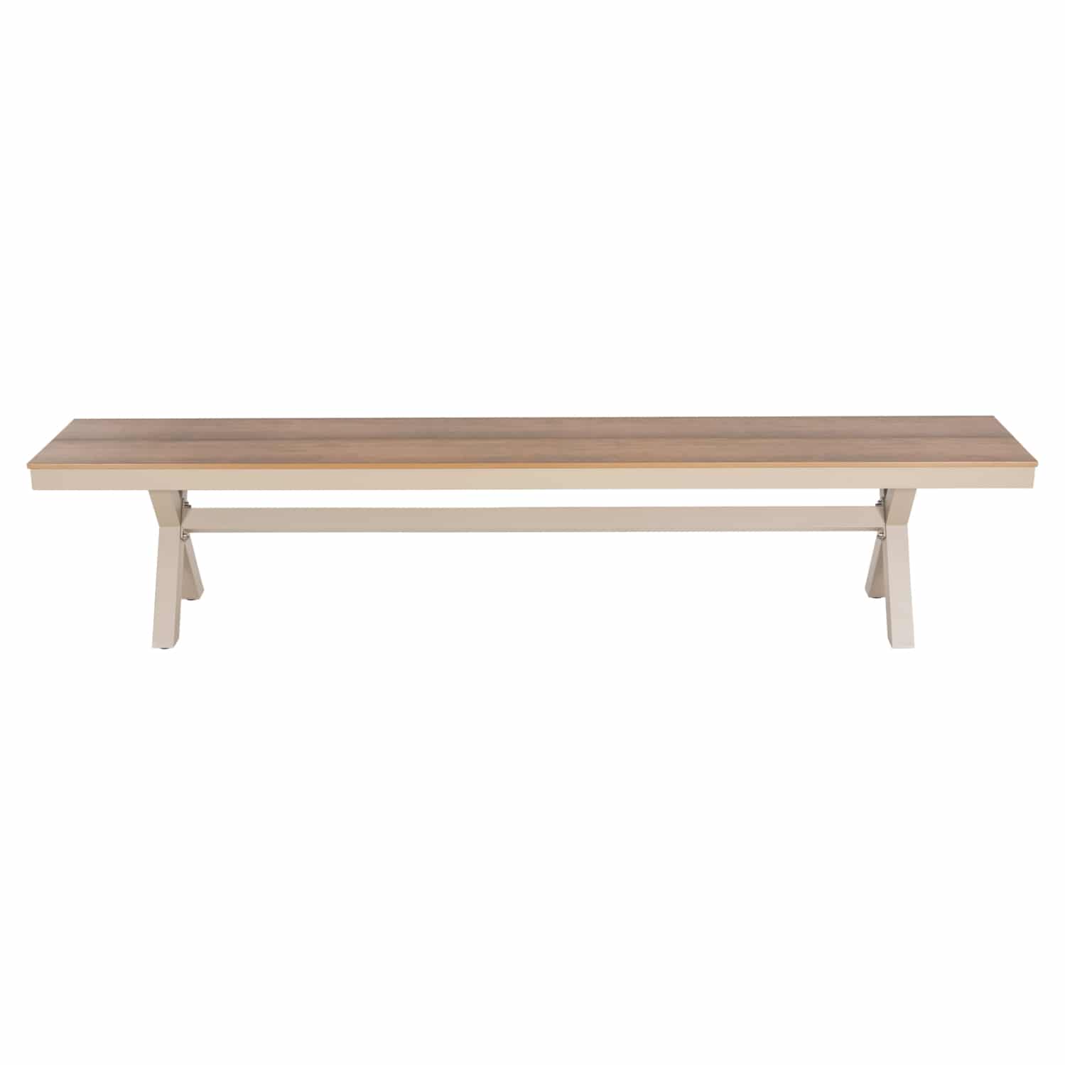 Το παγκάκι εξωτερικού χώρου TAWNEE έχει σκελετό αλουμινίου σε ΣΑΜΠΑΝΙ χρώμα, με δύο χιαστί βάσεις ενωμένες με μια οριζόντια φαρδιά ράβδο. Η επιφάνεια του καθίσματος είναι κατασκευασμένη από δύο πλάκες polywood σε χρώμα ΦΥΣΙΚΟΥ ΞΥΛΟΥ. Οι πλούσιες διαστάσεις του που άνετα βολεύονται 4 άτομα, το καθιστούν όμορφη και πρακτική προσθήκη για πληθώρα χρήσεων τόσο στο σπίτι, όσο και σε επαγγελματικούς χώρους.