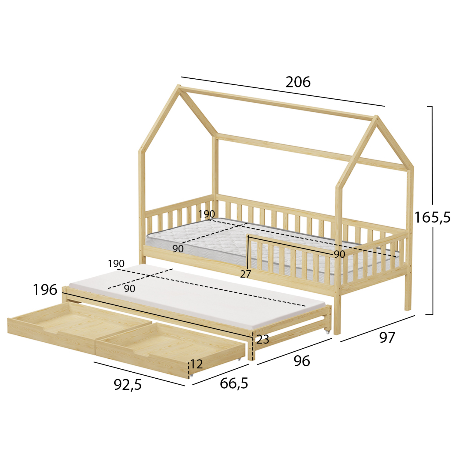 -Σας παρουσιάζουμε το καινούργιο παιδικό κρεβάτι PHYLLIS τύπου Montessori που σημαίνει ότι έχει σχεδιαστεί σύμφωνα με το εκπαιδευτικό σύστημα Montessori, σύμφωνα με το οποίο τα παιδιά μαθαίνουν καλύτερα, όταν επιλέγουν μόνα τους τι θα κάνουν. Το συγκεκριμένο διαθέτει και δεύτερο πρόσθετο κρεβάτι που αποθηκεύεται κάτω από κυρίως κρεβάτι, ενώ διαθέτει και δύο συρόμενα ρηχά συρτάρια κάτω από το πρόσθετο. Είναι σε διάσταση για μονό στρώμα 90×200 εκ το κυρίως κρεβάτι, και 90×190εκ το πρόσθετο, και αποτελεί μια άριστης ποιότητας, μοντέρνα και ασφαλή επιλογή για το παιδικό δωμάτιο μιας και διαθέτει ξύλινο κάγκελο περιμετρικά. Είναι ξύλινο σε ΦΥΣΙΚΟ χρώμα βαμμένο με αβλαβές βερνίκι με βάση το νερό και μη τοξικό, ιδανικό για παιδιά. Τα στρώματα τοποθετούνται σε τάβλες κατασκευασμένες από ξυλεία κόντρα πλακέ. Ολόκληρο το κρεβάτι έχει σχήμα σπιτιού και μάλιστα αρκετά ψηλό, που θα δώσει μια ευχάριστη, «ζεστή», και παιχνιδιάρικη όψη σε κάθε παιδικό δωμάτιο.