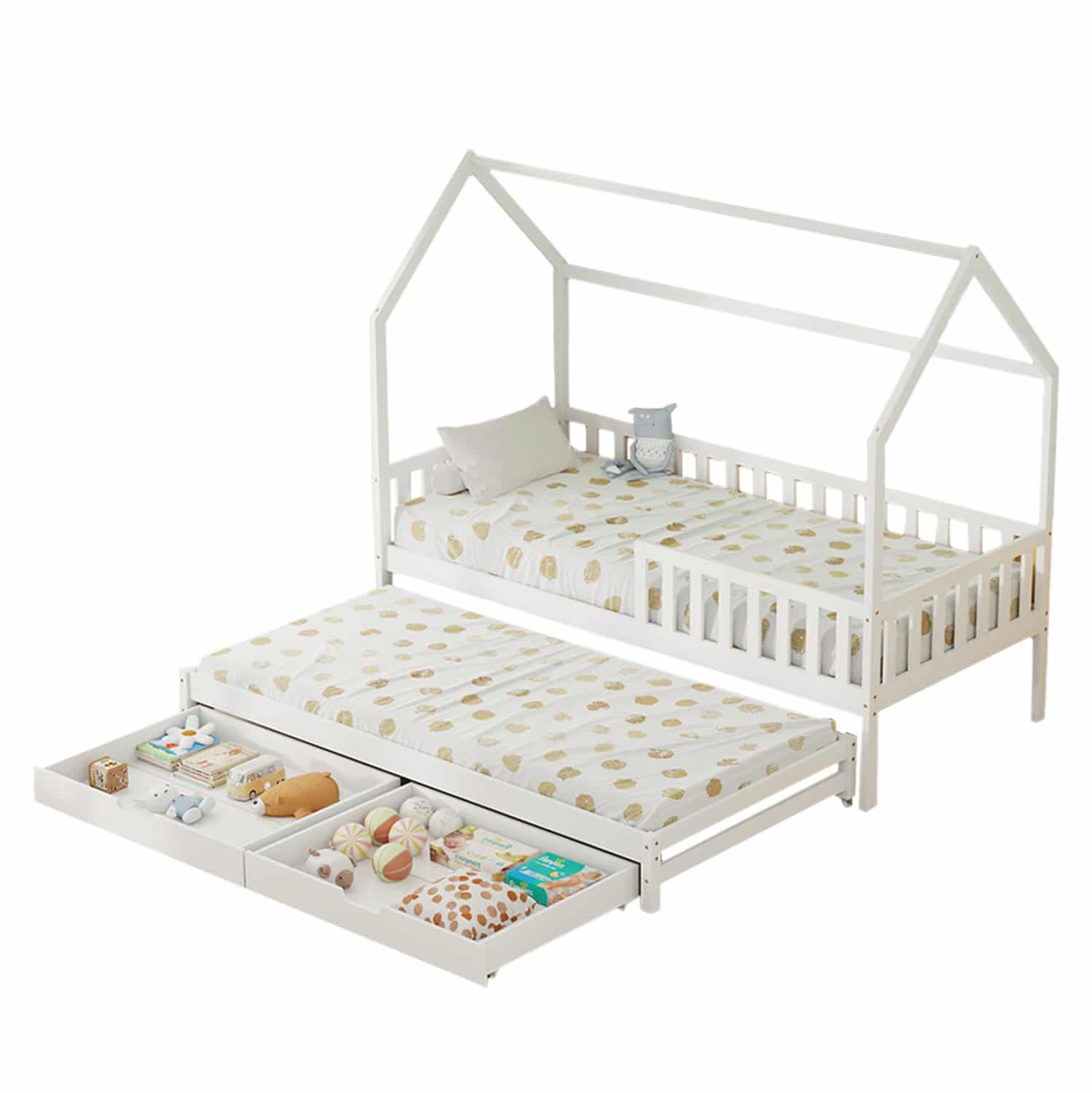 Το συγκεκριμένο διαθέτει και δεύτερο πρόσθετο κρεβάτι που αποθηκεύεται κάτω από κυρίως κρεβάτι, ενώ διαθέτει και δύο συρόμενα ρηχά συρτάρια κάτω από το πρόσθετο. Είναι σε διάσταση για μονό στρώμα 90×200 εκ το κυρίως κρεβάτι, και 90×190εκ το πρόσθετο, και αποτελεί μια άριστης ποιότητας, μοντέρνα και ασφαλή επιλογή για το παιδικό δωμάτιο μιας και διαθέτει ξύλινο κάγκελο περιμετρικά.