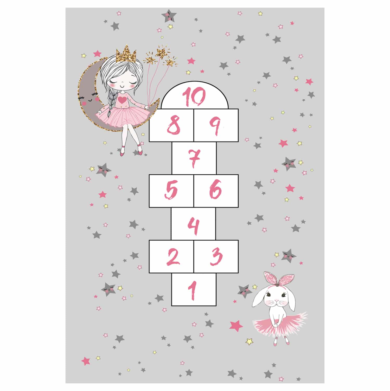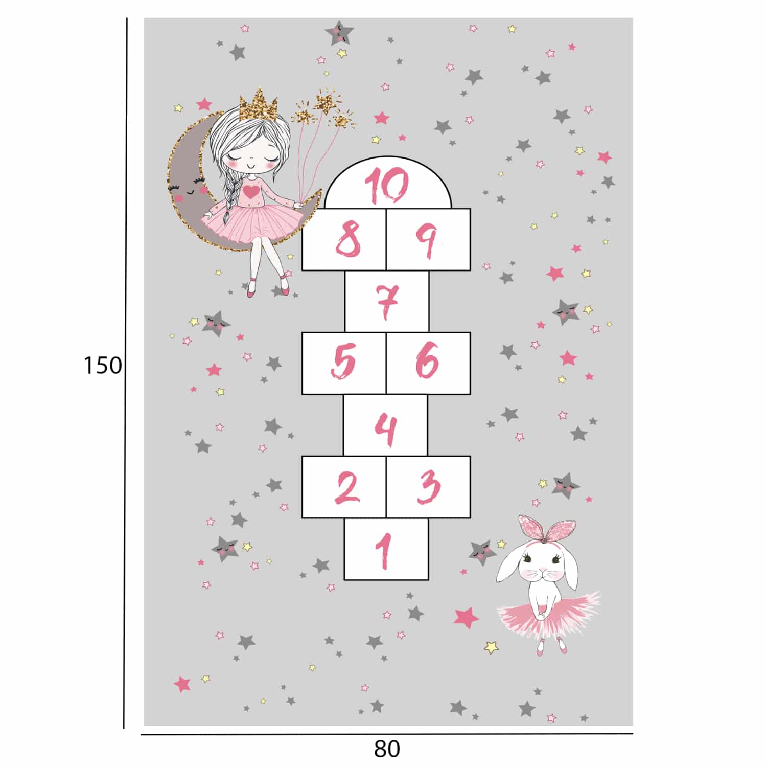 Αυτό το όμορφο χαλί (κυρίως για κορίτσια) έχει κυρίαρχα χρώματα το ΕΚΡΟΥ σε όλη την επιφάνεια του χαλιού, και δεν διαθέτει μπορντούρα. Το σχέδιο του χαλιού απεικονίζει ένα κοριτσάκι να κάθεται σε ένα φεγγαράκι, ενώ το κυρίαρχο στοιχείο του χαλιού είναι μια όμορφη απεικόνιση του κλασικού παιχνιδιού «κουτσό». Άλλωστε, γιατί να μην είναι το ίδιο το χαλί… παιχνίδι;