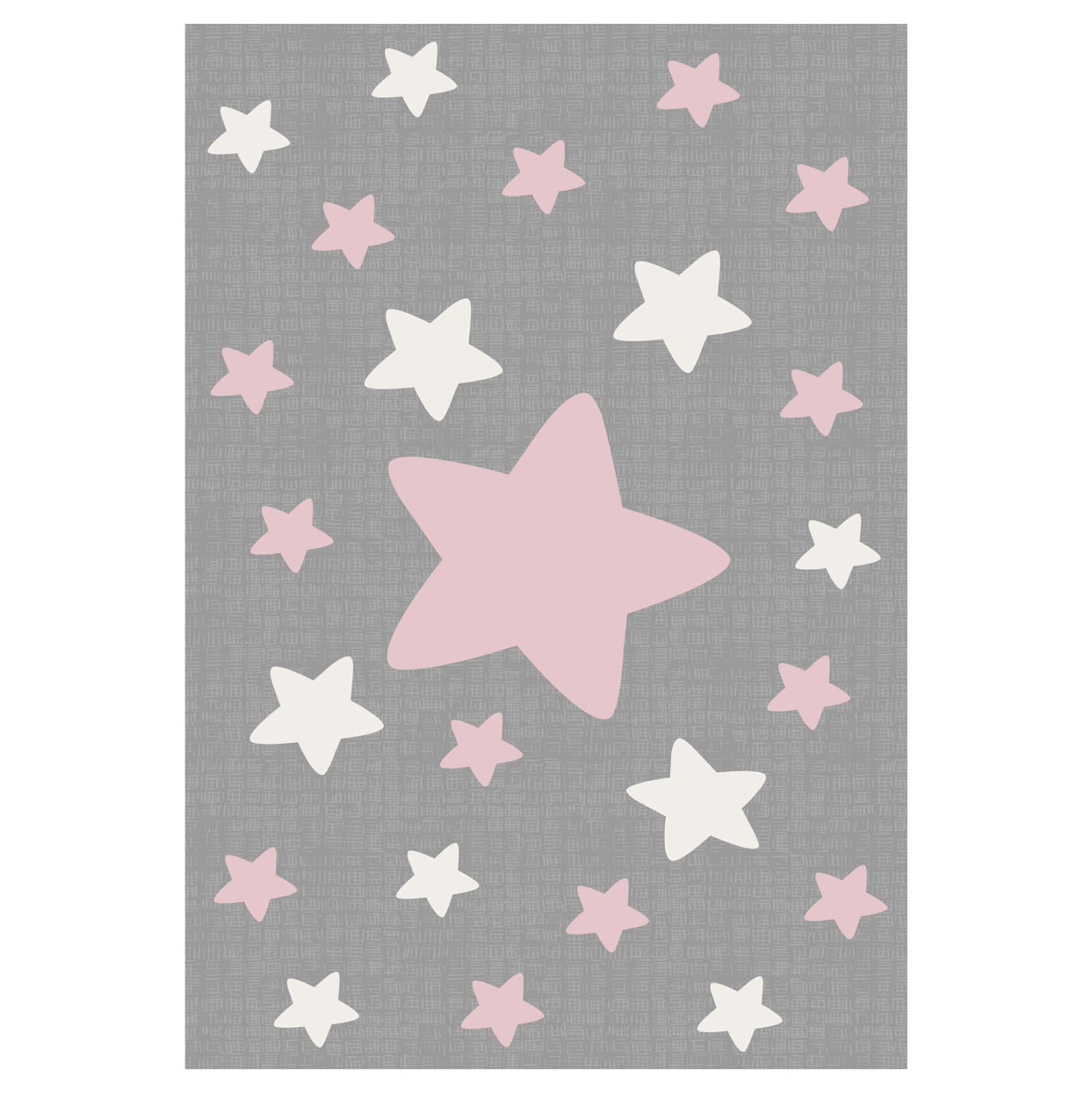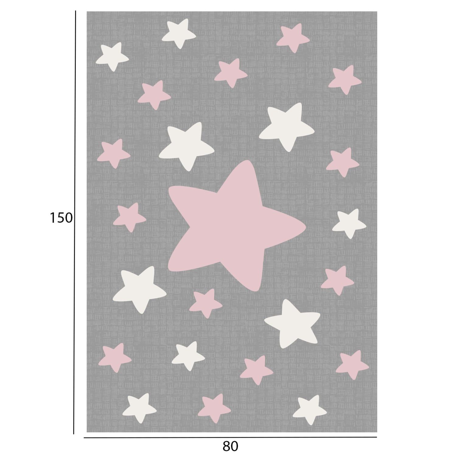 Αυτό το όμορφο χαλί έχει φόντο με κυρίαρχο χρώμα το γκρι σε όλη την επιφάνεια του χαλιού, και δεν διαθέτει μπορντούρα. Το σχέδιο του χαλιού είναι ευχάριστο και απεικονίζει αστέρια άσπρα και ροζ σε διάφορα μεγέθη.