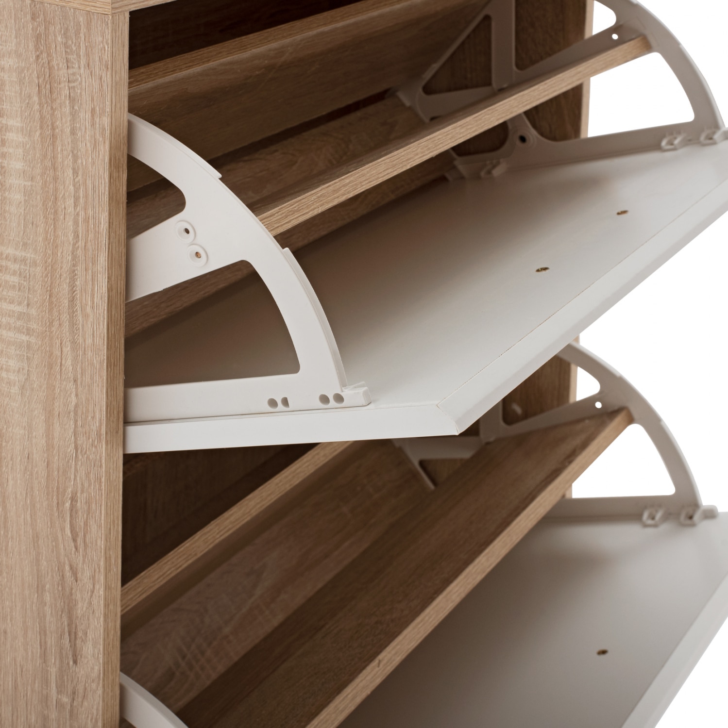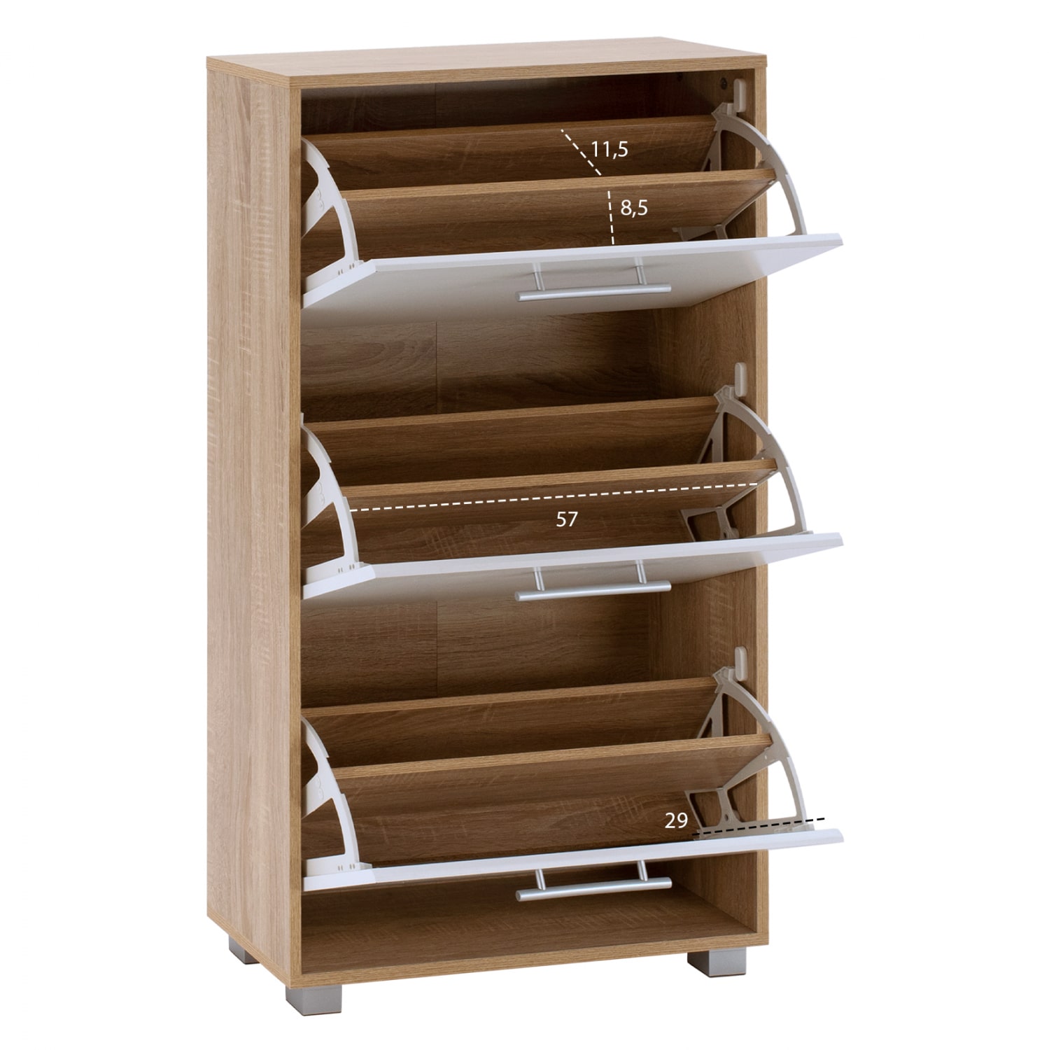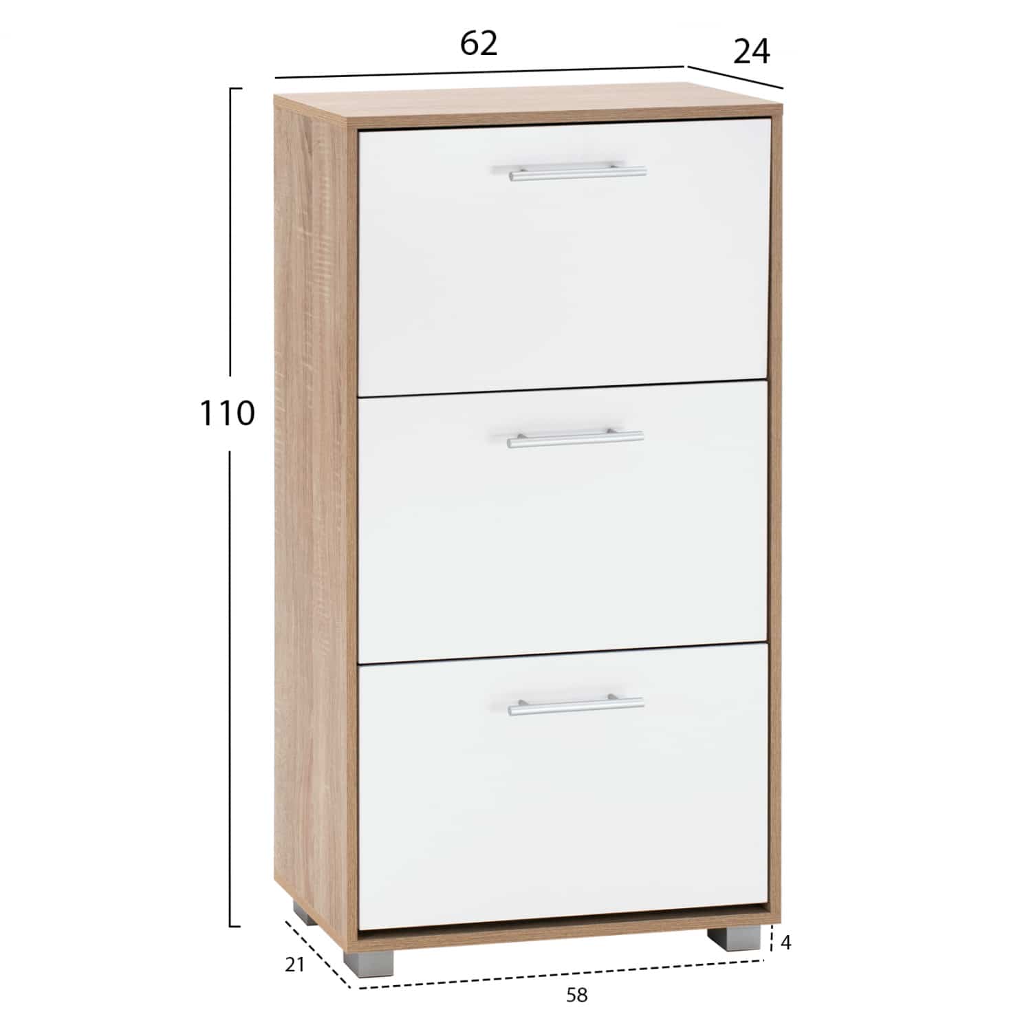 Παπουτσοθήκη από μελαμίνη άριστης ποιότητας, με 3 ανακλινόμενα ντουλάπια που χωράνε 18-21 ζευγάρια παπούτσια, σε sonama και λευκή απόχρωση με 3 πόρτες.