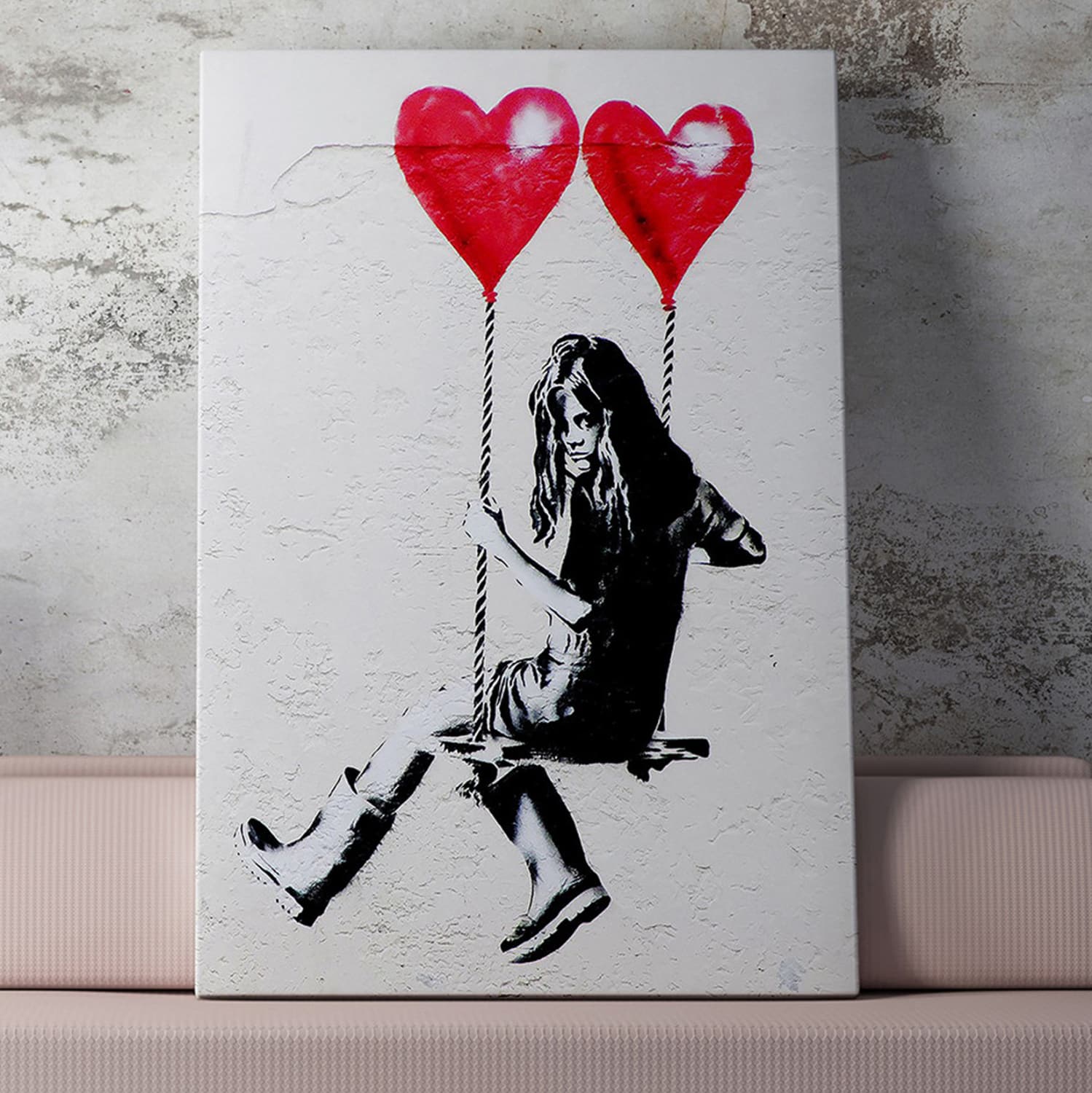 Ένας πίνακας τοίχου μεταμορφώνει τον τρόπο που αντιλαμβανόμαστε έναν χώρο. Διακοσμήστε, λοιπόν, τον χώρο σας με την καινούργια σειρά πινάκων τοίχου GOBI! Αυτός ο ασπρόμαυρος πίνακας που απεικονίζει ένα κορίτσι σε μια κούνια που κρέμεται από κόκκινα μπαλόνια-καρδιές έχει υλοποιηθεί σε ψηφιακά εκτυπωμένο καμβά (50% βαμβάκι-50% πολυεστέρας) σε πλαίσιο από ξύλο.