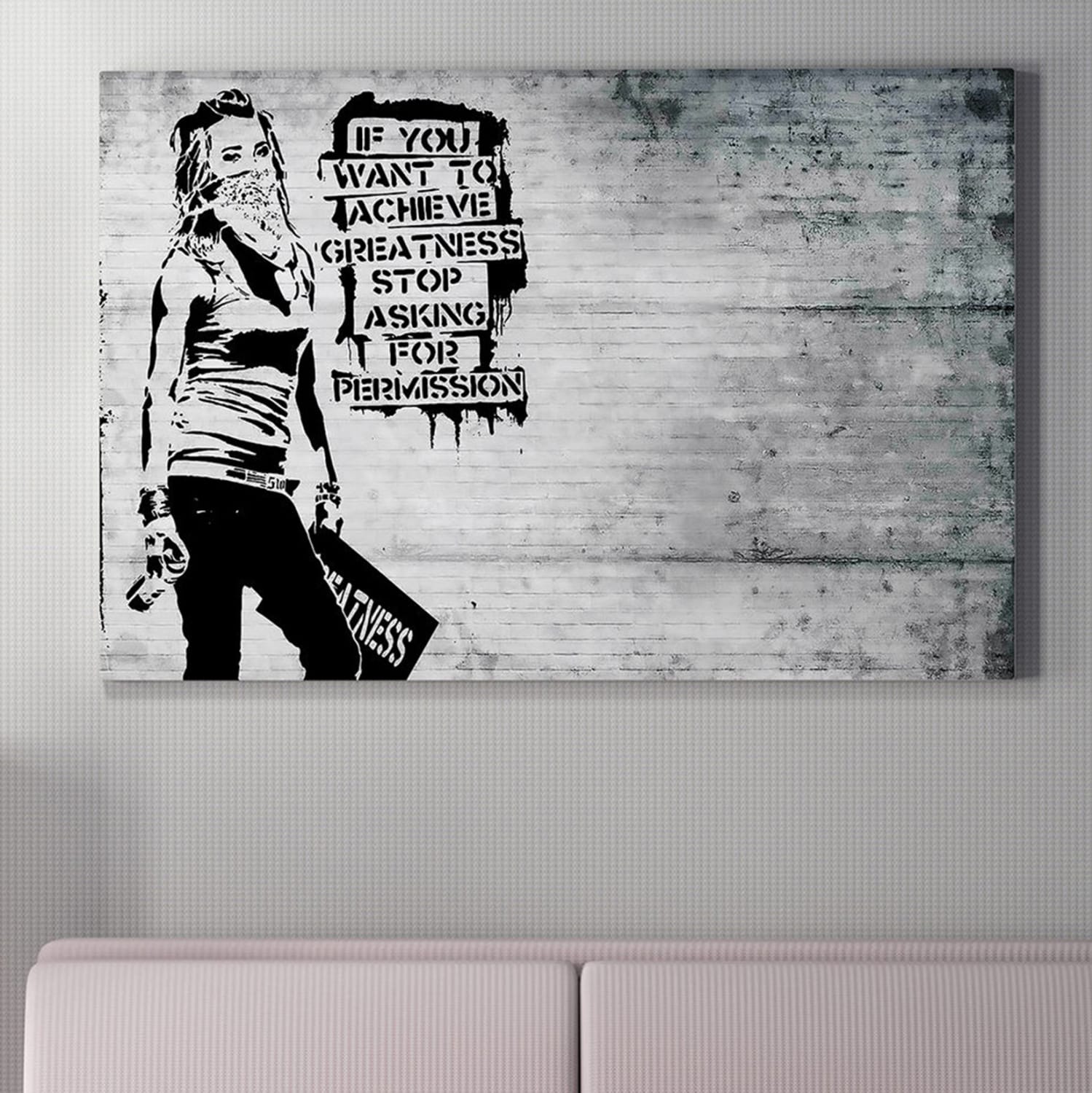Ένας πίνακας τοίχου μεταμορφώνει τον τρόπο που αντιλαμβανόμαστε έναν χώρο. Διακοσμήστε, λοιπόν, τον χώρο σας με την καινούργια σειρά πινάκων τοίχου GOBI! Αυτός ο ασπρόμαυρος πίνακας που απεικονίζει μια τοιχογραφία με slogan, έχει υλοποιηθεί σε ψηφιακά εκτυπωμένο καμβά (50% βαμβάκι-50% πολυεστέρας) σε πλαίσιο από ξύλο.