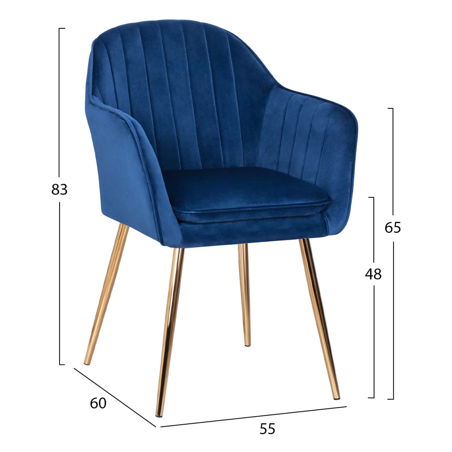 Η πολυθρόνα SAWYER είναι επενδυμένη με ύφασμα βελούδο σε μπλε απόχρωση με μεταλλικό σκελετό σε χρυσή απόχρωση.