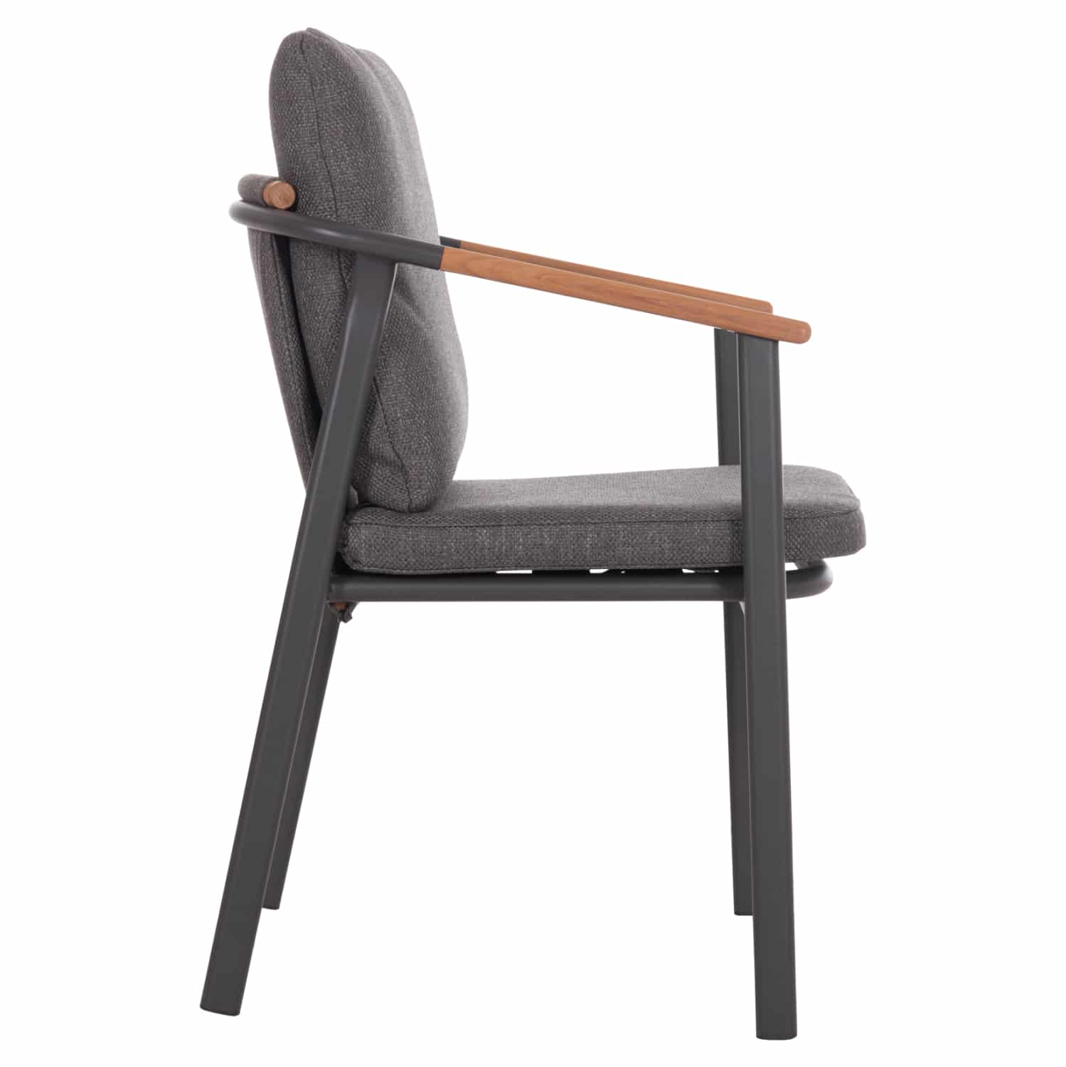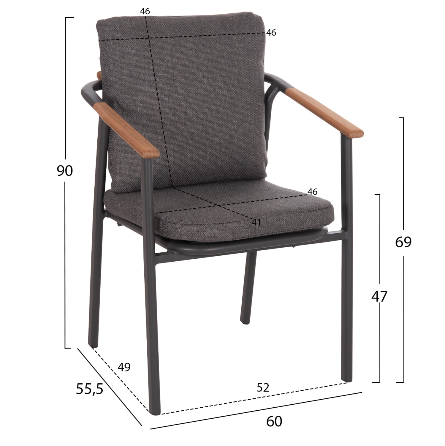 Η πολυθρόνα τραπεζαρίας αλουμινίου SENTI σε ΣΚΟΥΡΟ ΓΚΡΙ χρώμα διαθέτει μαξιλάρια πλάτης και καθίσματος επενδυμένα με ύφασμα OLEFIN, στο ίδιο χρώμα. Η πινελιά με το ξύλο teak στα μπράτσα δίνει μια όμορφη όψη στην πολυθρόνα. Συνδυάστε την με ένα όμορφο τραπέζι και δημιουργήστε μια τραπεζαρία εξωτερικού χώρου που θα κερδίσει τις εντυπώσεις.